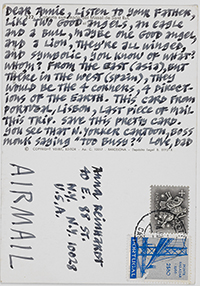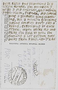 Reinhardt’s last visit to Spain was a quick one. Traveling on the ocean liner SS Leonardo da Vinci from Naples back home to New York, he stopped in Barcelona for the day on July 11, 1967. While Reinhardt did not keep a travel journal for this trip, he wrote several postcards to his wife and daughter documenting this stop. While he mentions spending the whole day in Barcelona, he does not describe how he spent his time on this visit.