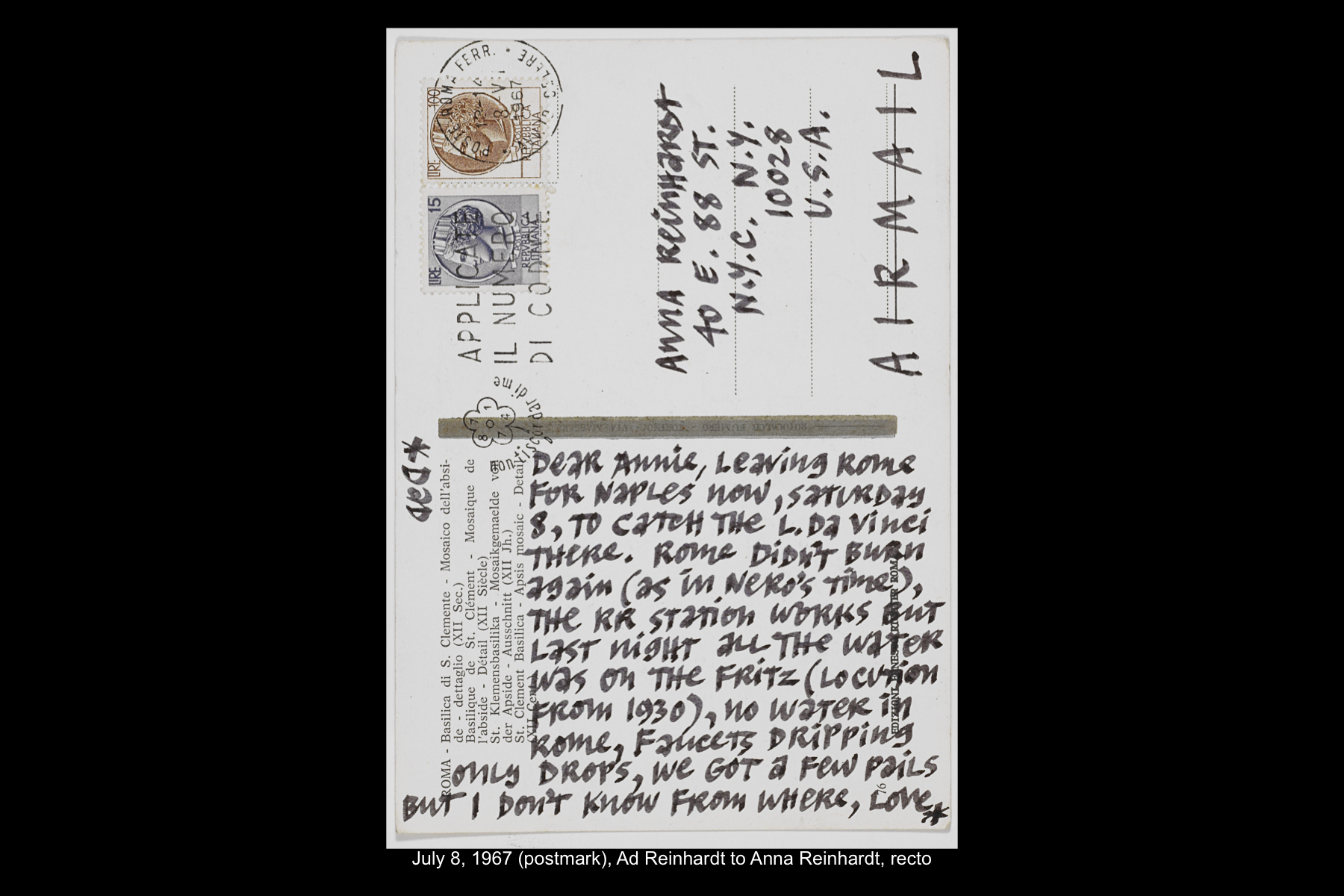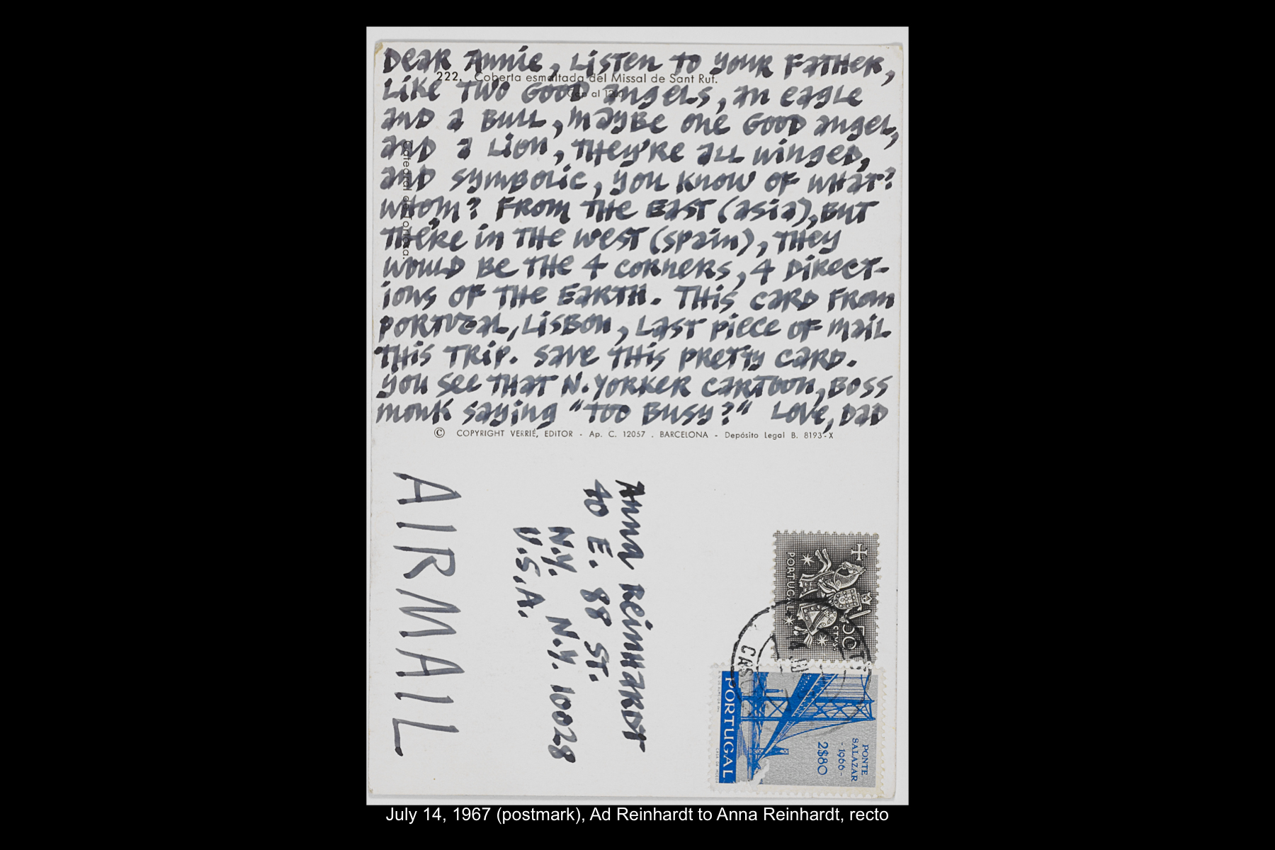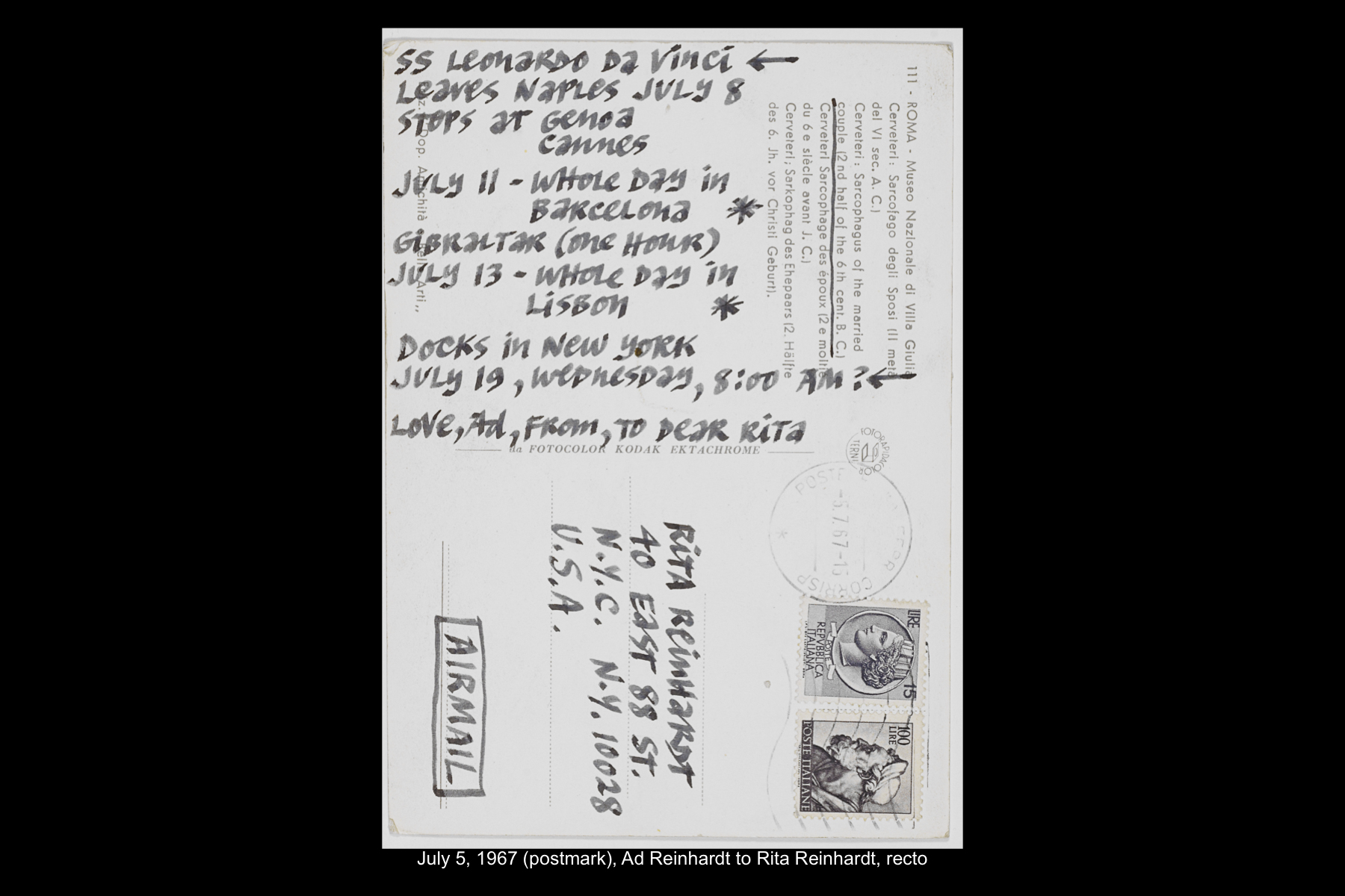 Reinhardt’s last visit to Spain was a quick one. Traveling on the ocean liner SS Leonardo da Vinci from Naples back home to New York, he stopped in Barcelona for the day on July 11, 1967. While Reinhardt did not keep a travel journal for this trip, he wrote several postcards to his wife and daughter documenting this stop. While he mentions spending the whole day in Barcelona, he does not describe how he spent his time on this visit.