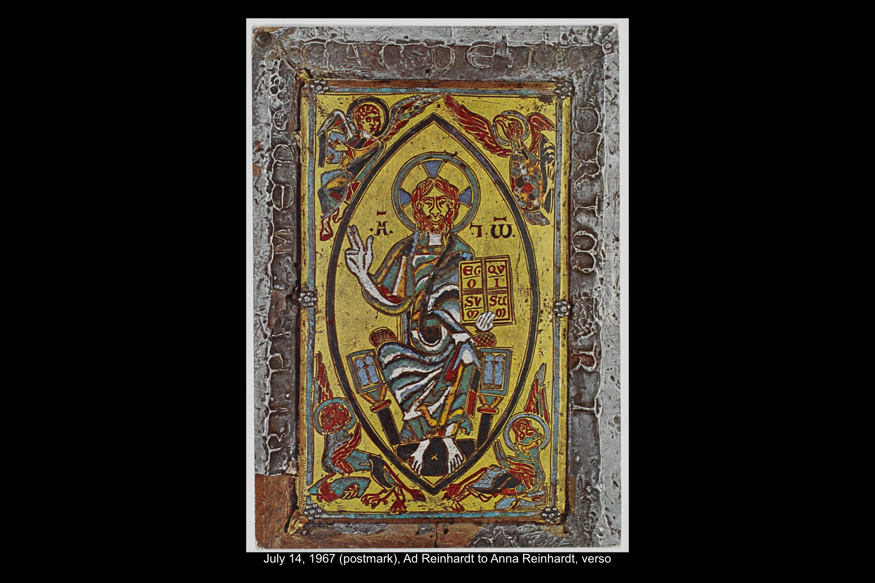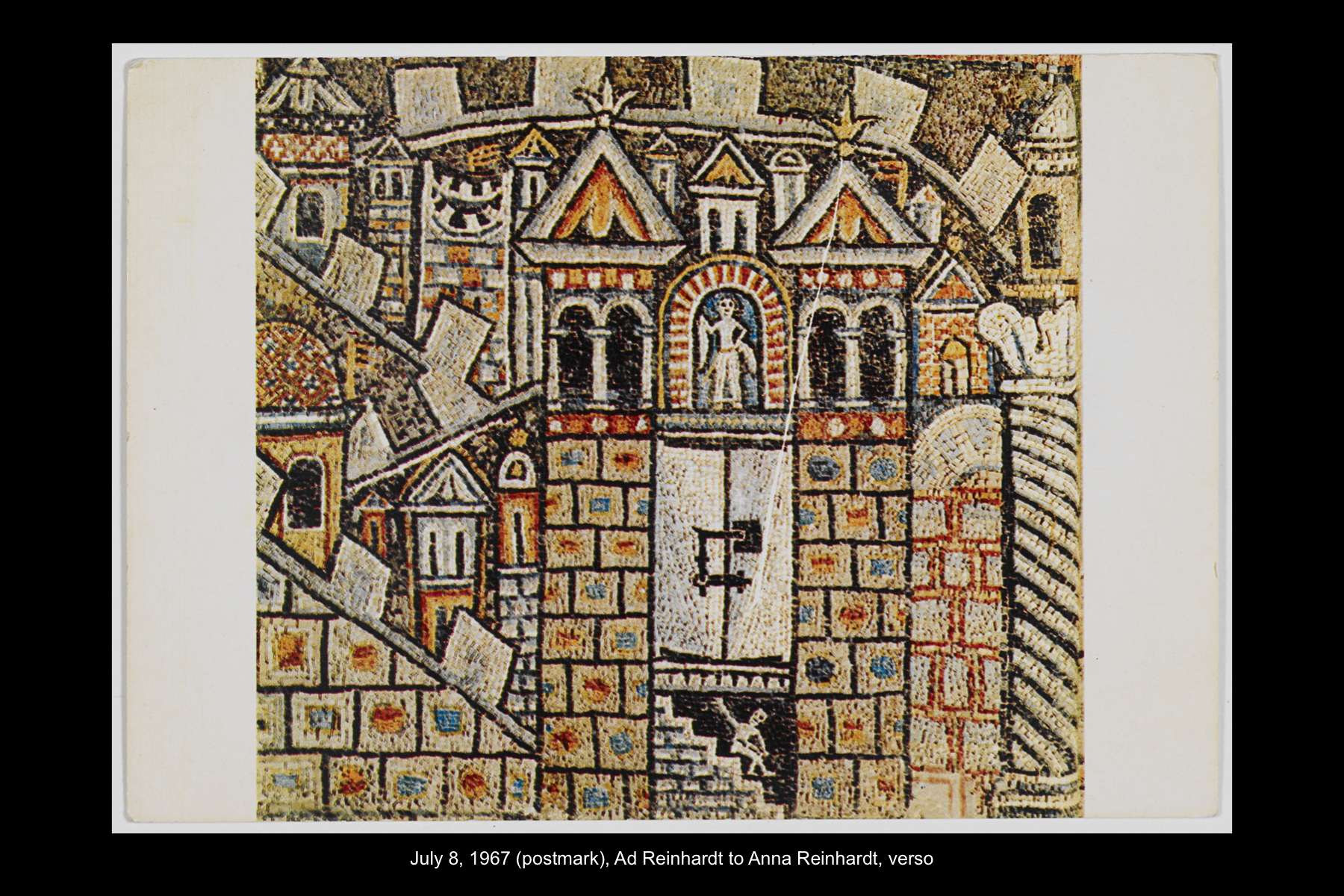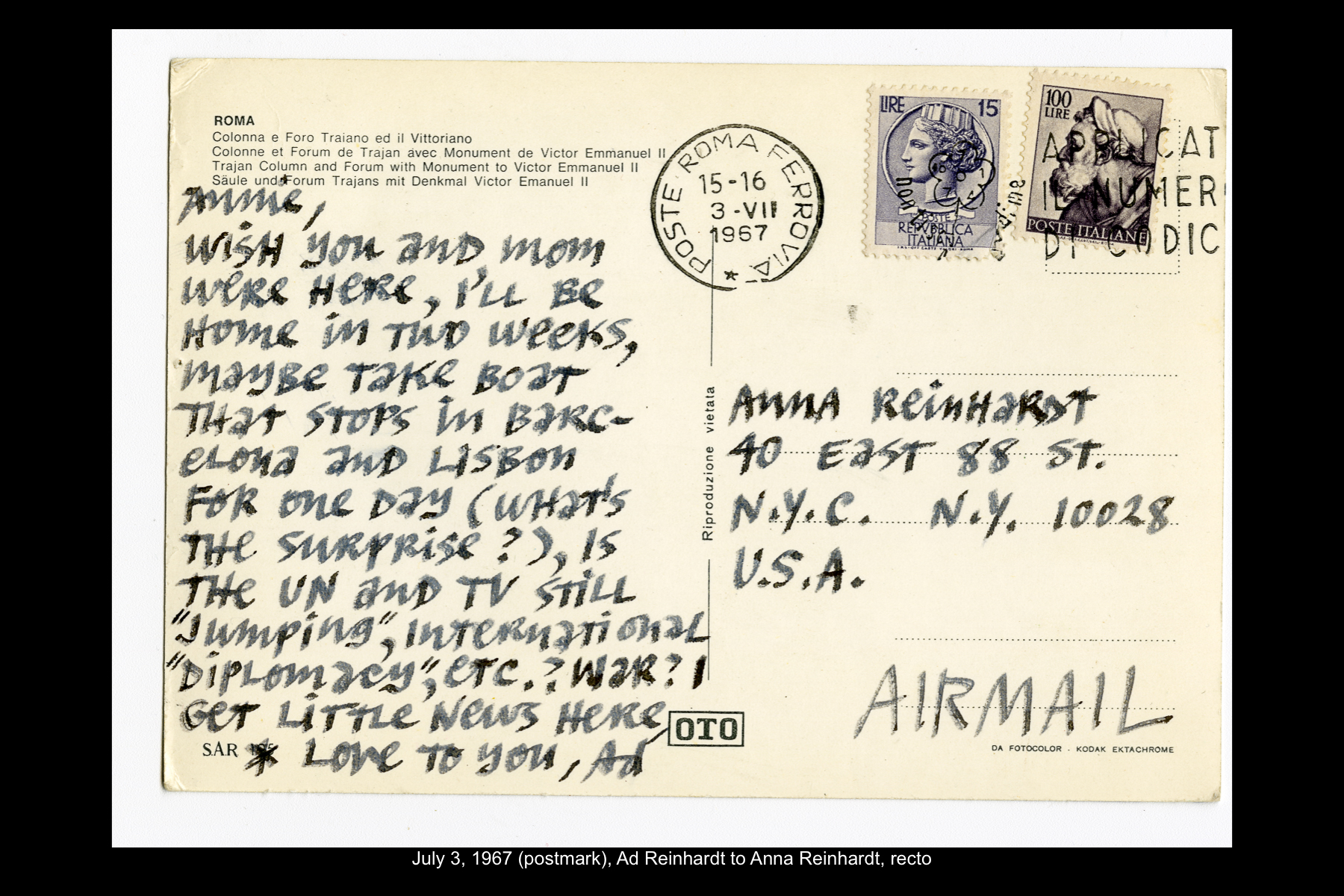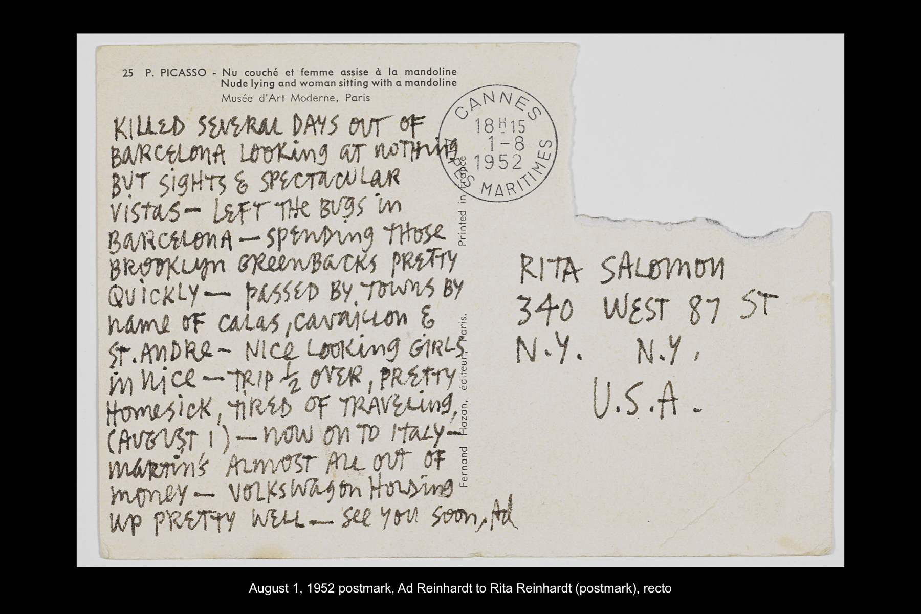 Reinhardt’s last visit to Spain was a quick one. Traveling on the ocean liner SS Leonardo da Vinci from Naples back home to New York, he stopped in Barcelona for the day on July 11, 1967. While Reinhardt did not keep a travel journal for this trip, he wrote several postcards to his wife and daughter documenting this stop. While he mentions spending the whole day in Barcelona, he does not describe how he spent his time on this visit.