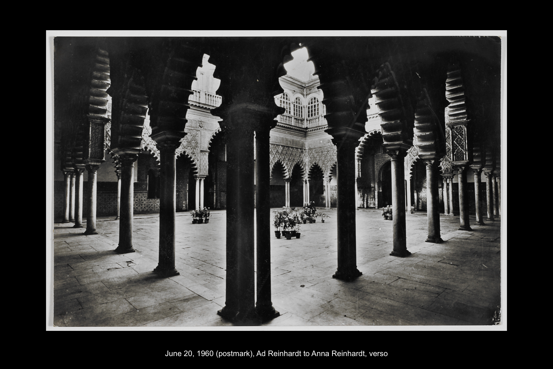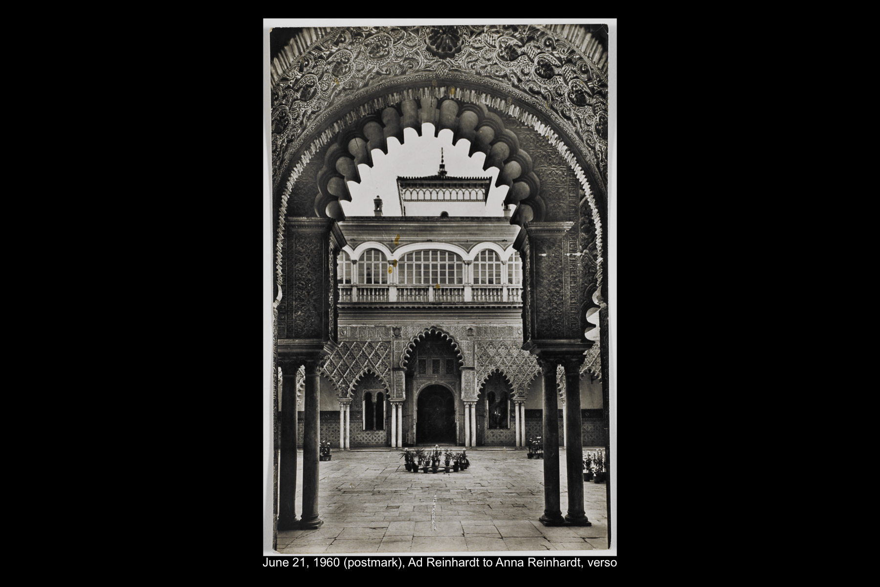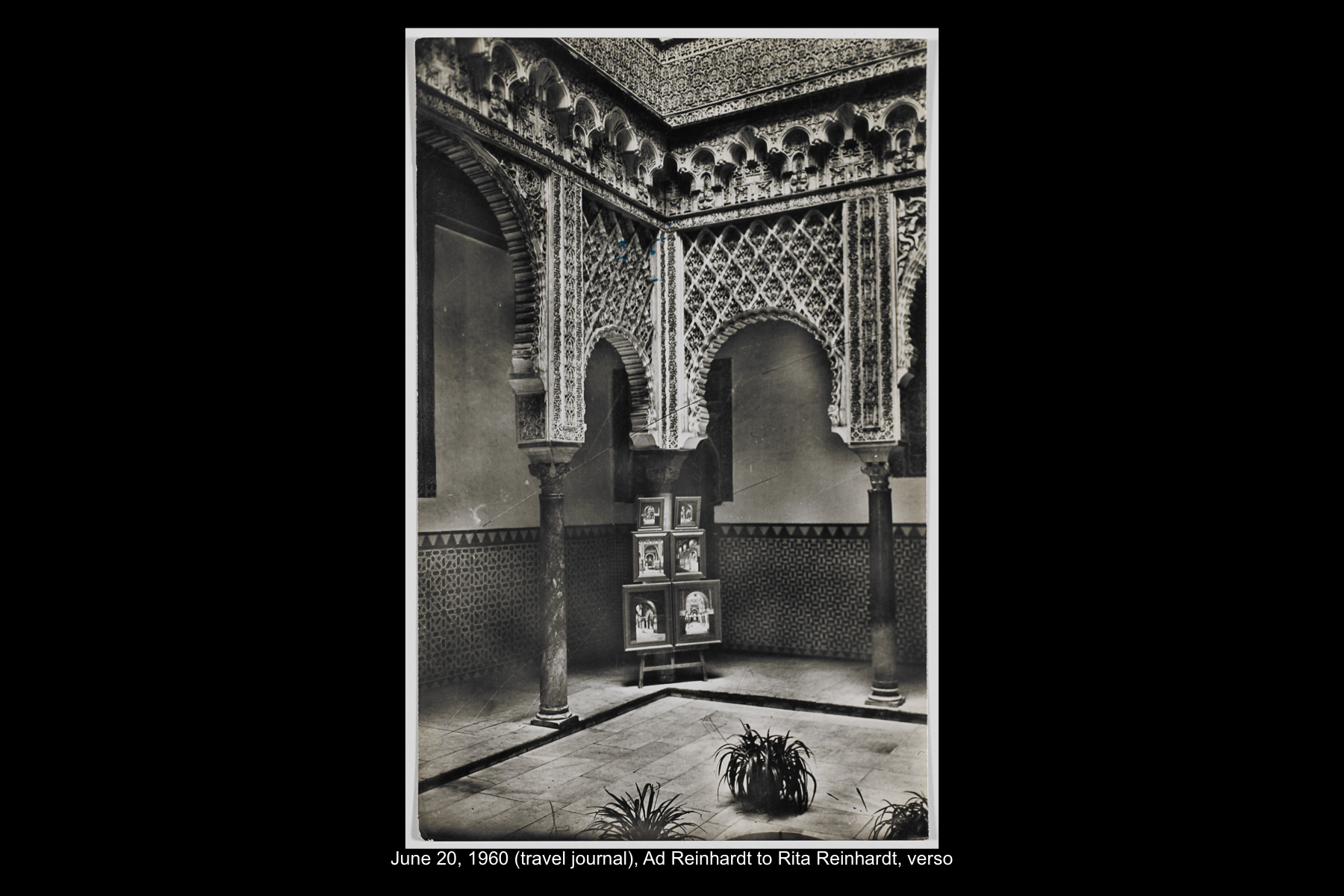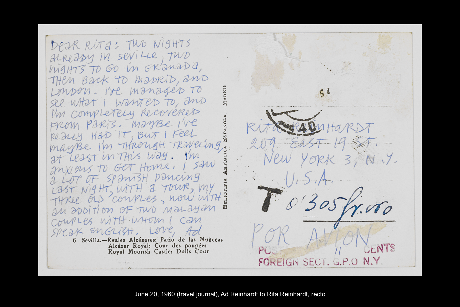 In June 1960 Reinhardt travelled to Paris to install his solo show Mysticisme athée at Galerie Iris Clert. After the opening of his Paris show, he flew to Madrid and visited the Prado museum, followed by a five-day Thomas Cook bus tour of Madrid, Córdoba, Sevilla, and Granada. While Reinhardt did not keep a travel journal for this 3-week trip, correspondence to his wife, Rita, and daughter, Anna, provides many key details. In letters to Rita he indicates that taking the Cook’s tour was the best way to ensure that he would see all that he wanted to see of Moorish Spain. See here for postcards and letters to his wife, Rita, and daughter, Anna from this trip. See here for Reinhardt's passport pages showing stamps from this trip.