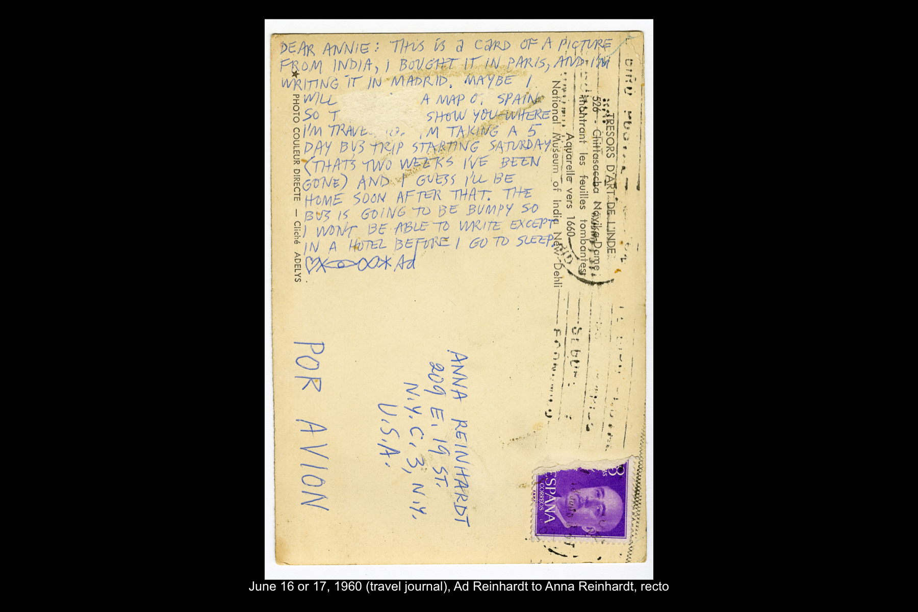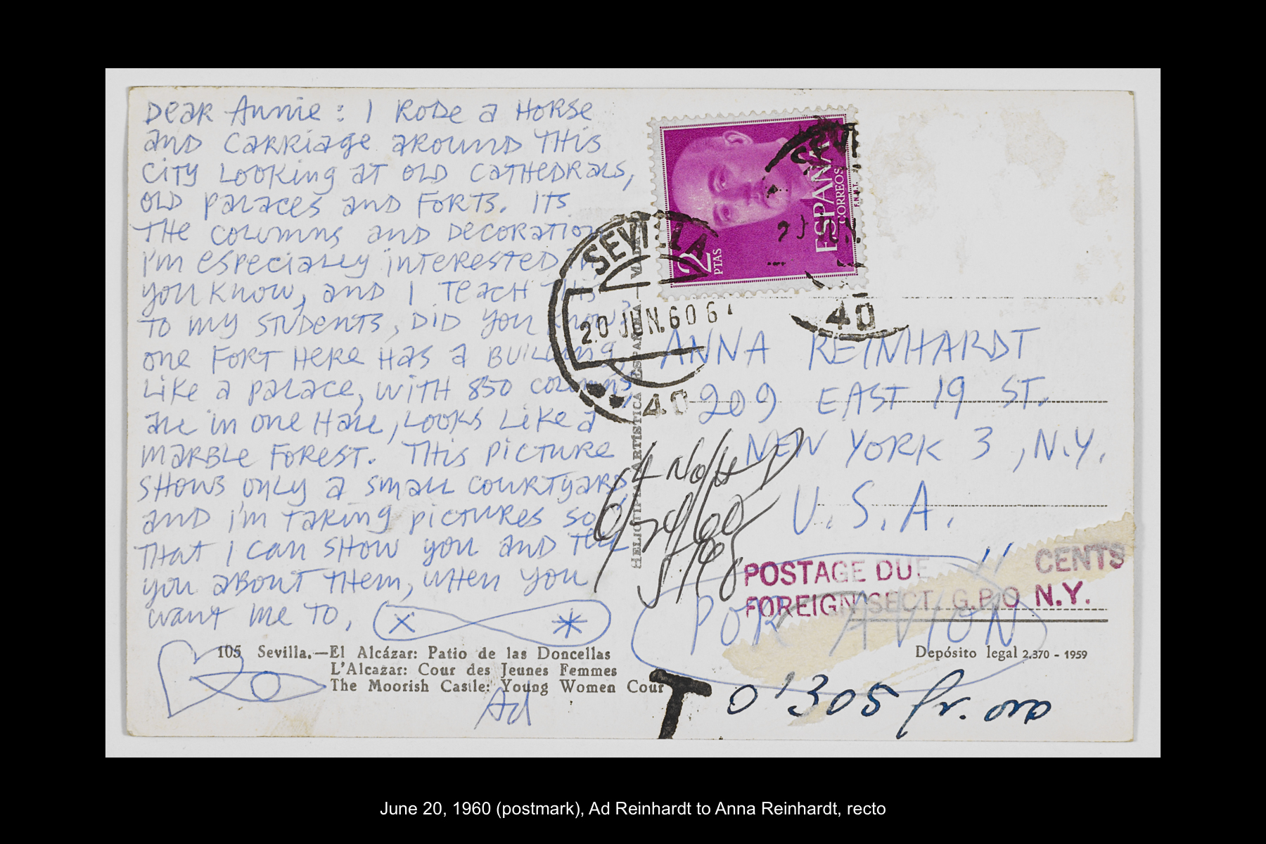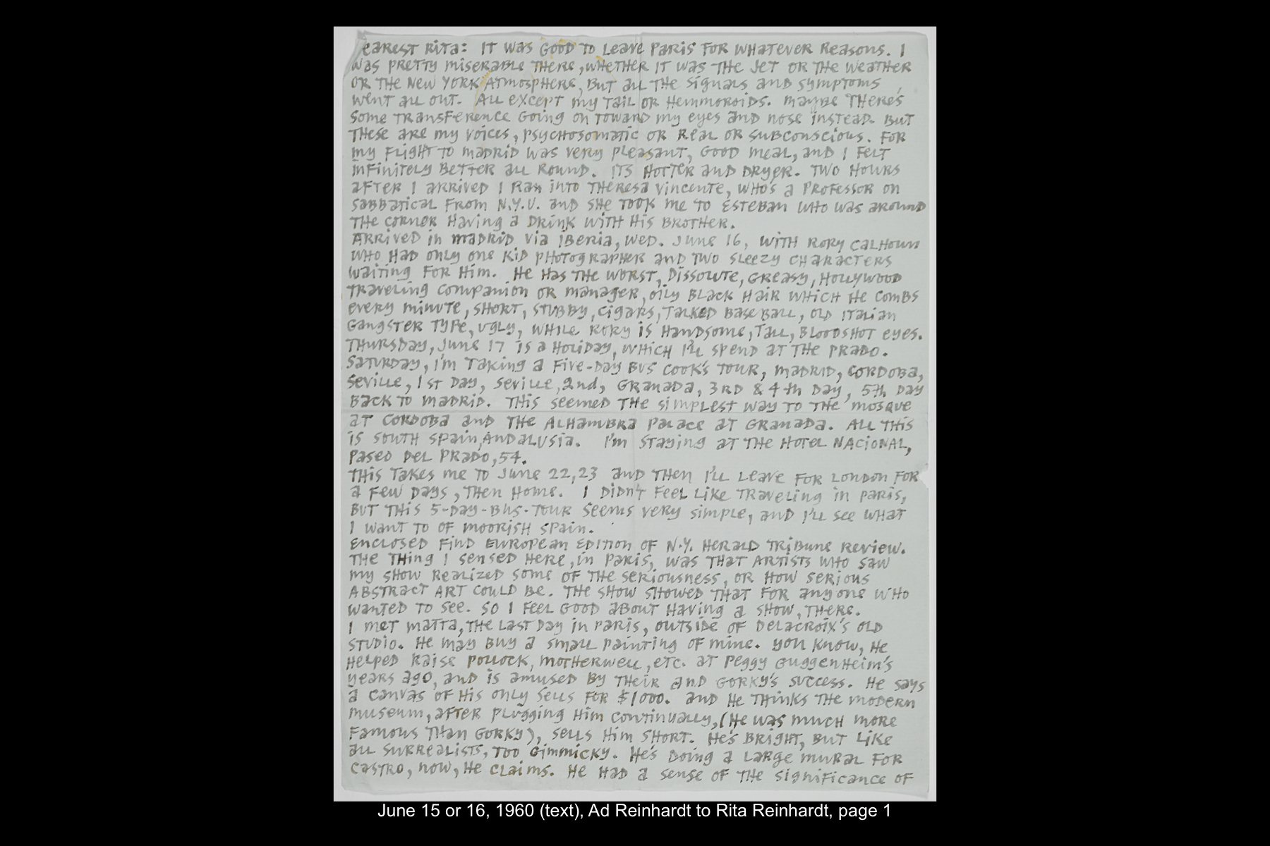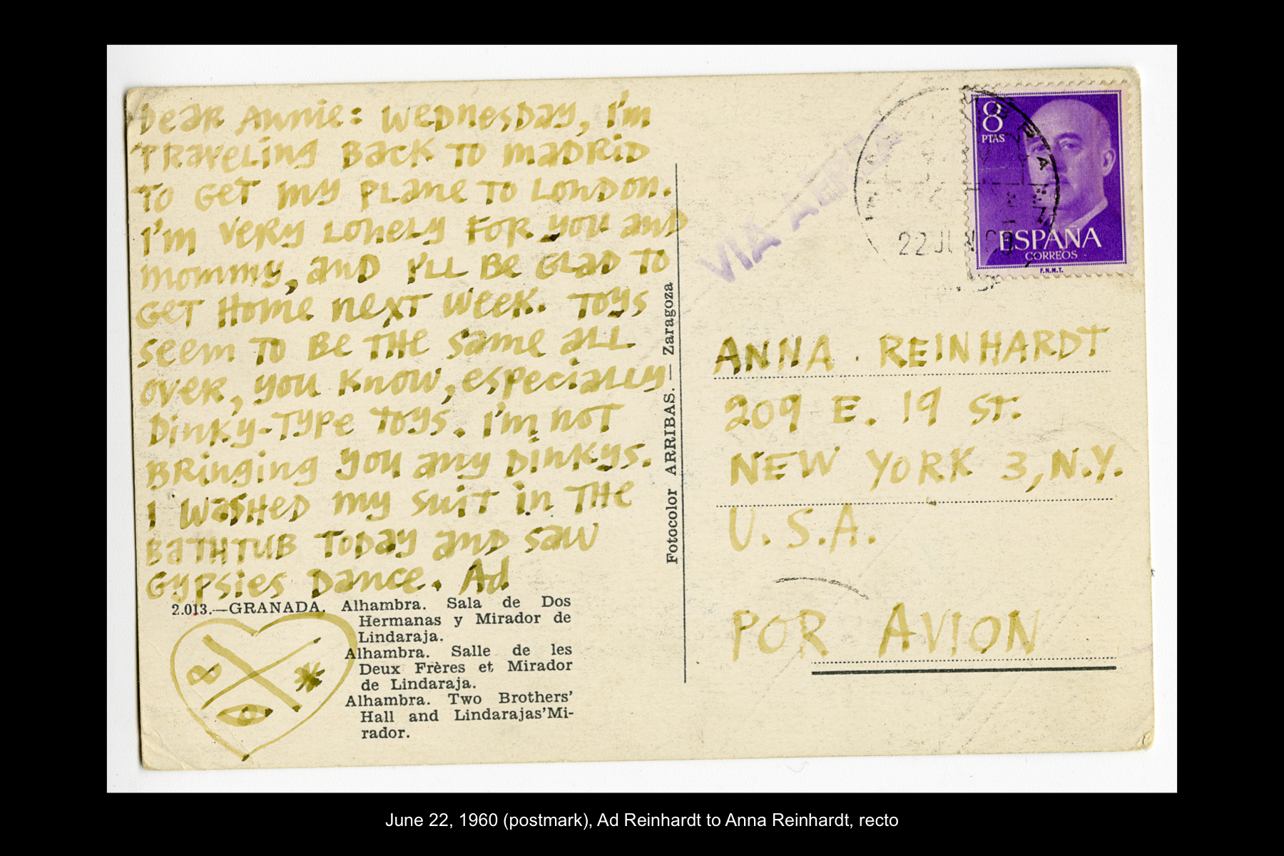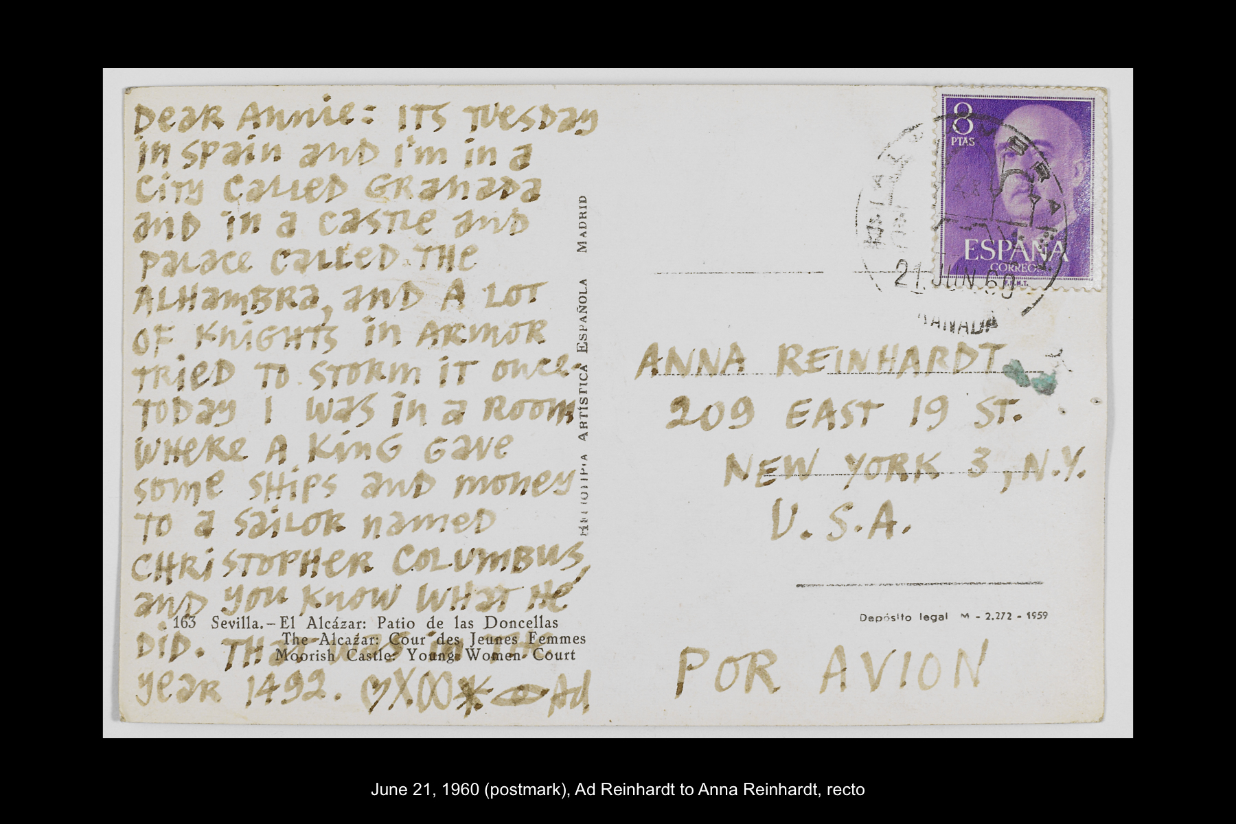 In June 1960 Reinhardt travelled to Paris to install his solo show Mysticisme athée at Galerie Iris Clert. After the opening of his Paris show, he flew to Madrid and visited the Prado museum, followed by a five-day Thomas Cook bus tour of Madrid, Córdoba, Sevilla, and Granada. While Reinhardt did not keep a travel journal for this 3-week trip, correspondence to his wife, Rita, and daughter, Anna, provides many key details. In letters to Rita he indicates that taking the Cook’s tour was the best way to ensure that he would see all that he wanted to see of Moorish Spain. See here for postcards and letters to his wife, Rita, and daughter, Anna from this trip. See here for Reinhardt's passport pages showing stamps from this trip.