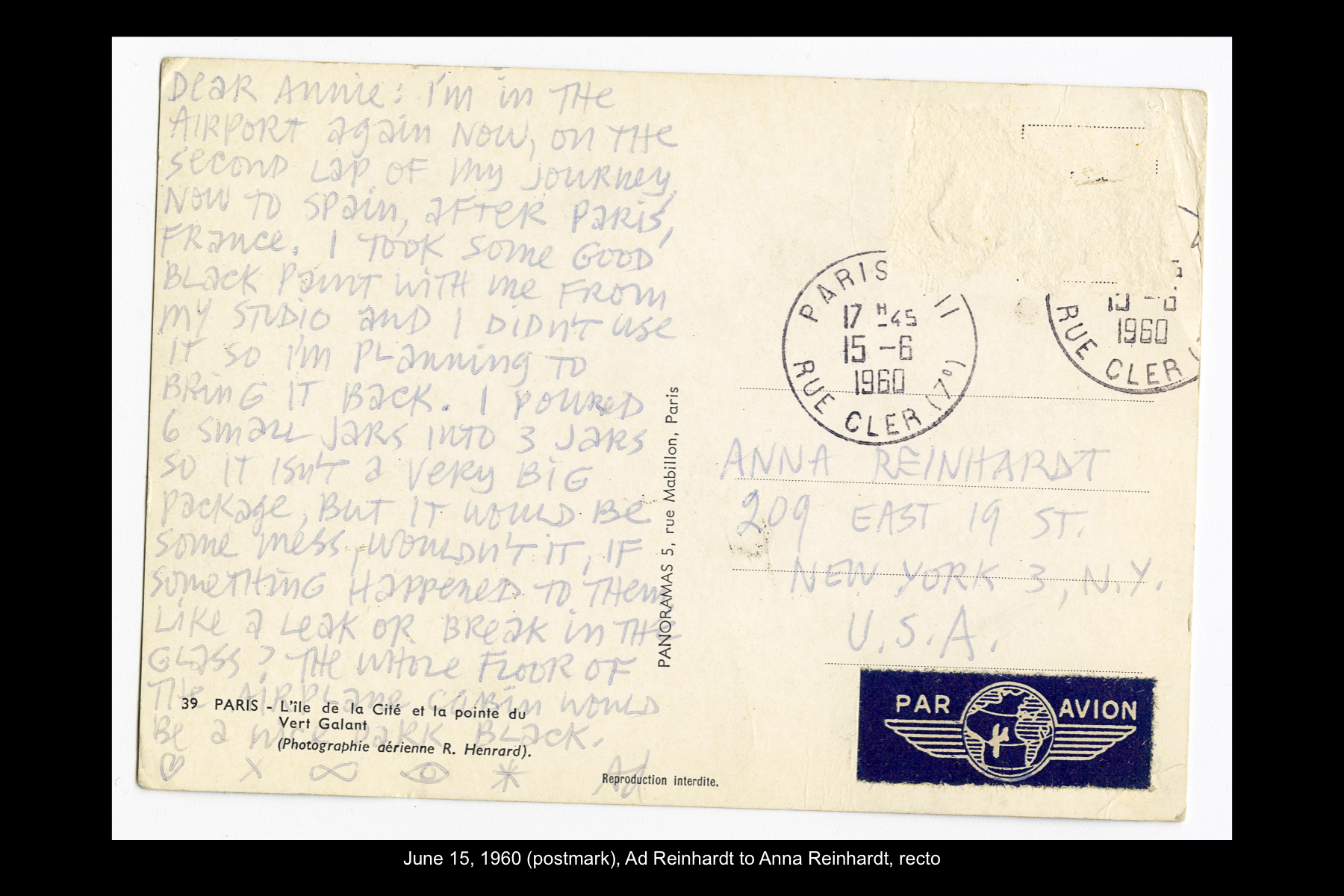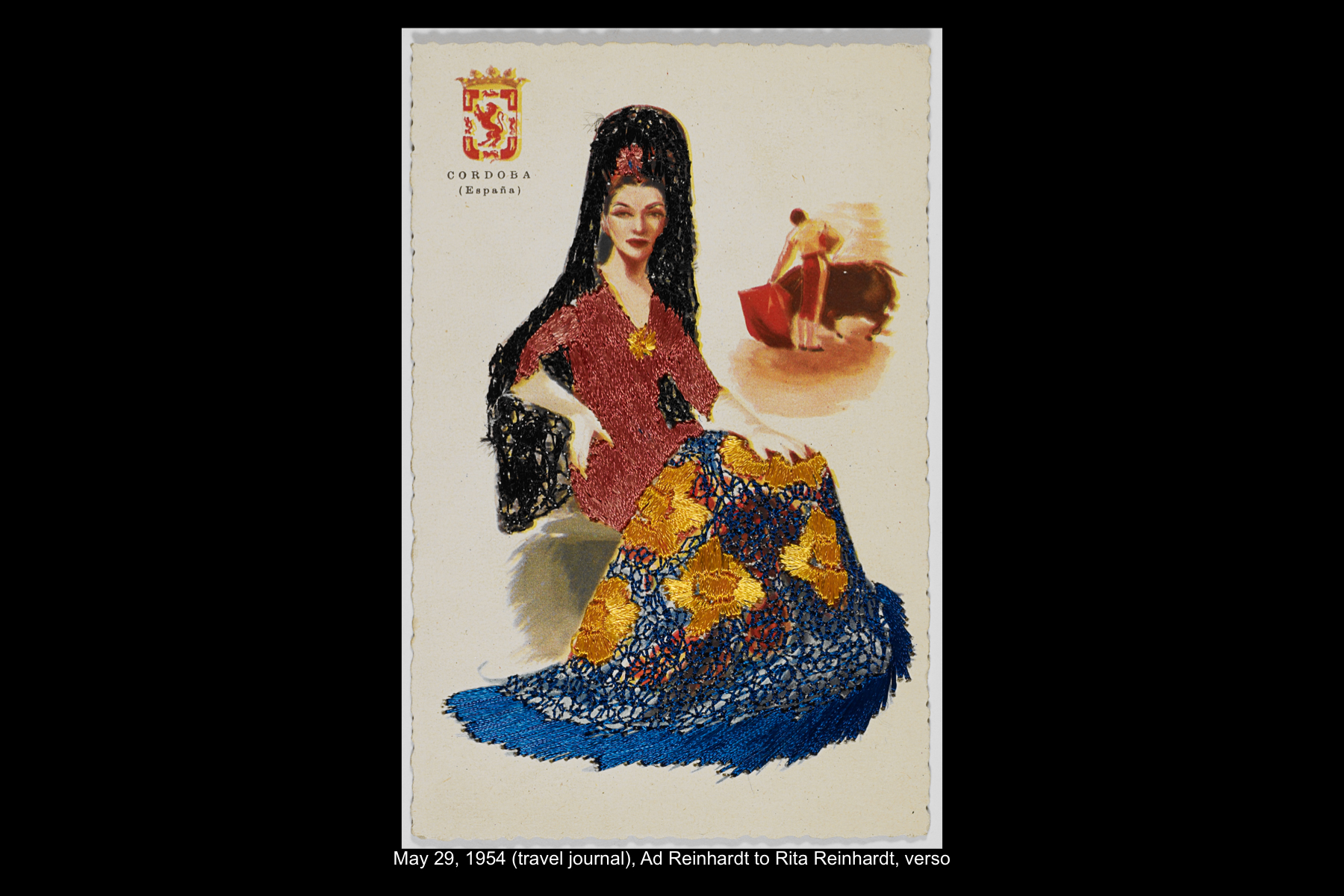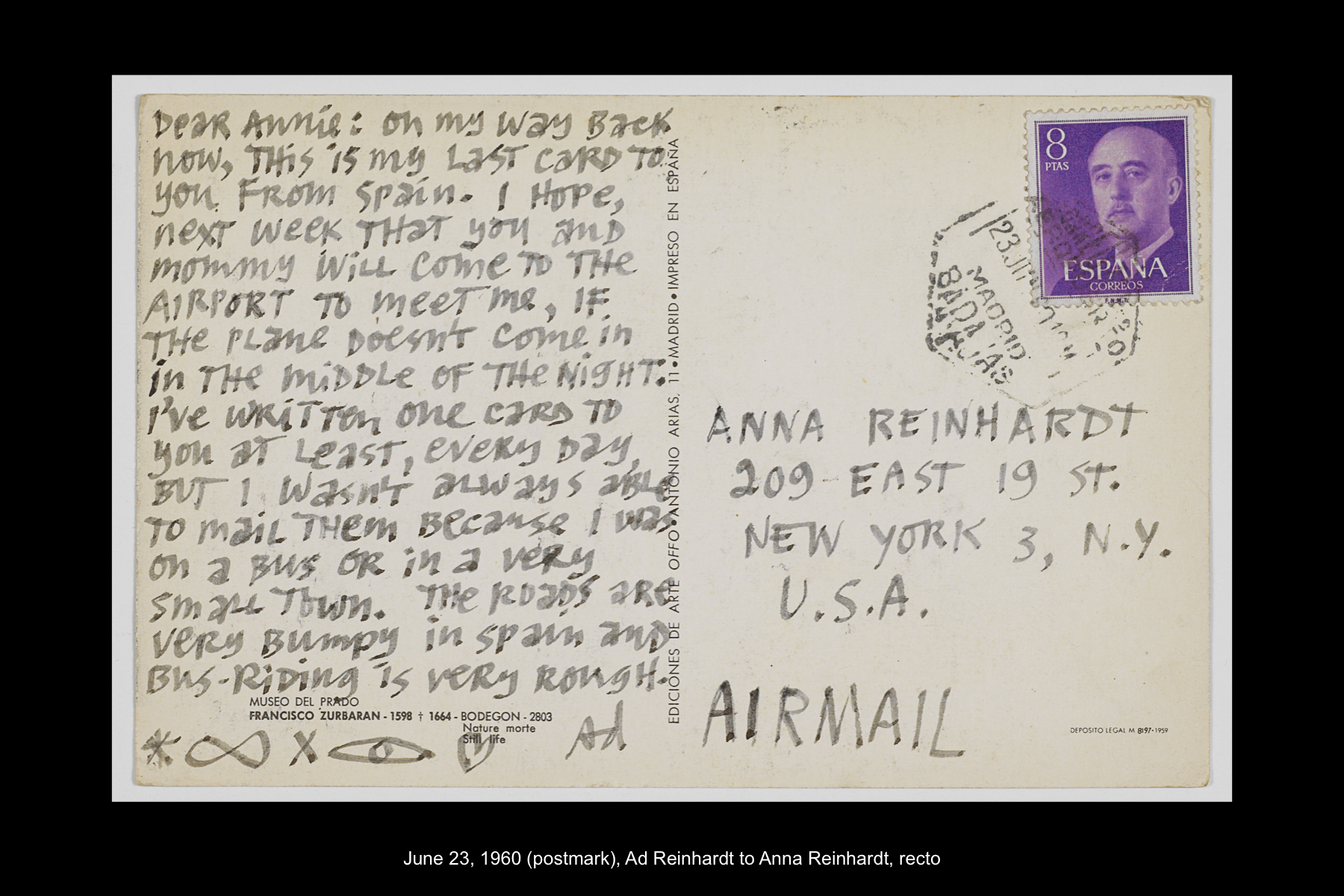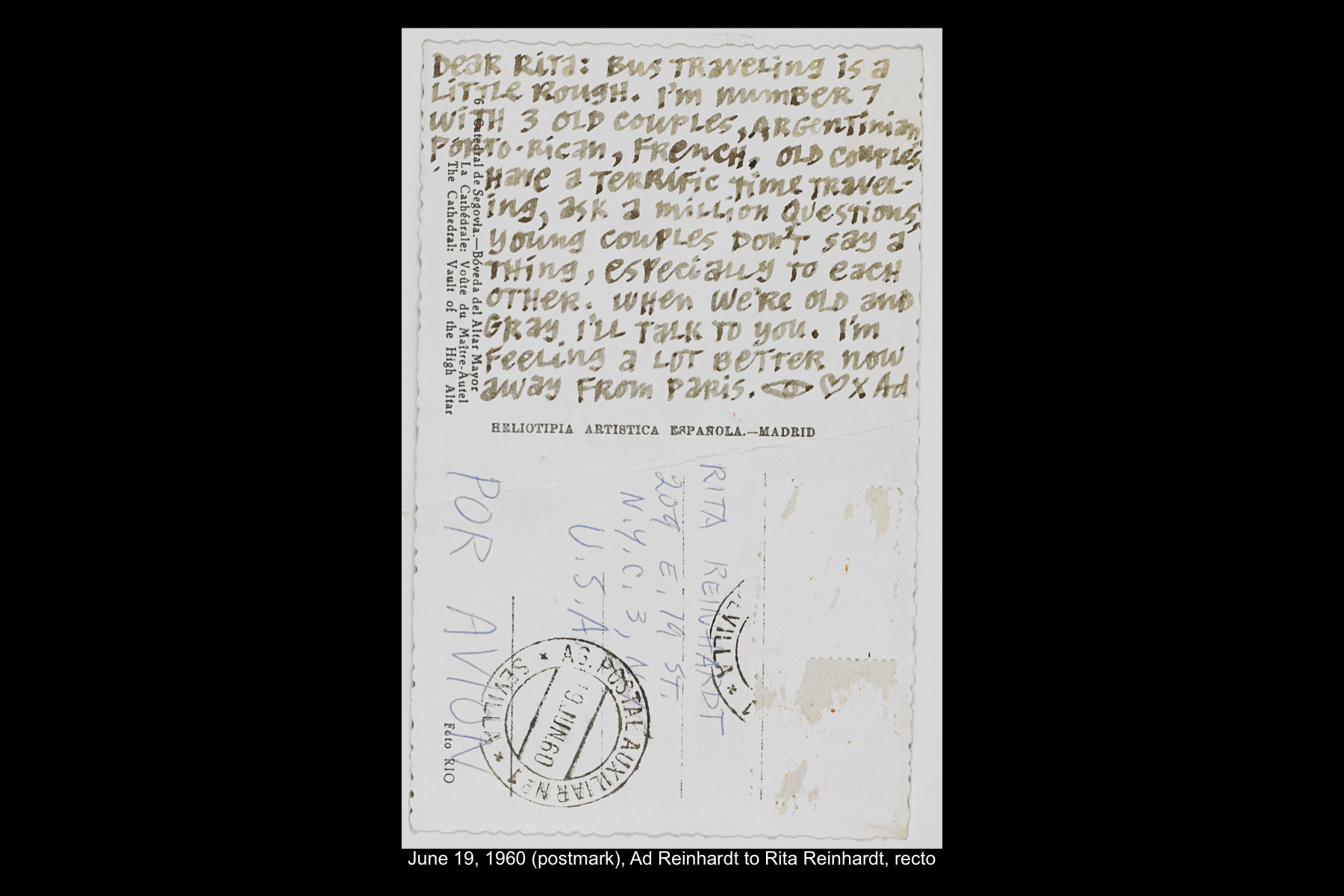 In June 1960 Reinhardt travelled to Paris to install his solo show Mysticisme athée at Galerie Iris Clert. After the opening of his Paris show, he flew to Madrid and visited the Prado museum, followed by a five-day Thomas Cook bus tour of Madrid, Córdoba, Sevilla, and Granada. While Reinhardt did not keep a travel journal for this 3-week trip, correspondence to his wife, Rita, and daughter, Anna, provides many key details. In letters to Rita he indicates that taking the Cook’s tour was the best way to ensure that he would see all that he wanted to see of Moorish Spain. See here for postcards and letters to his wife, Rita, and daughter, Anna from this trip. See here for Reinhardt's passport pages showing stamps from this trip.