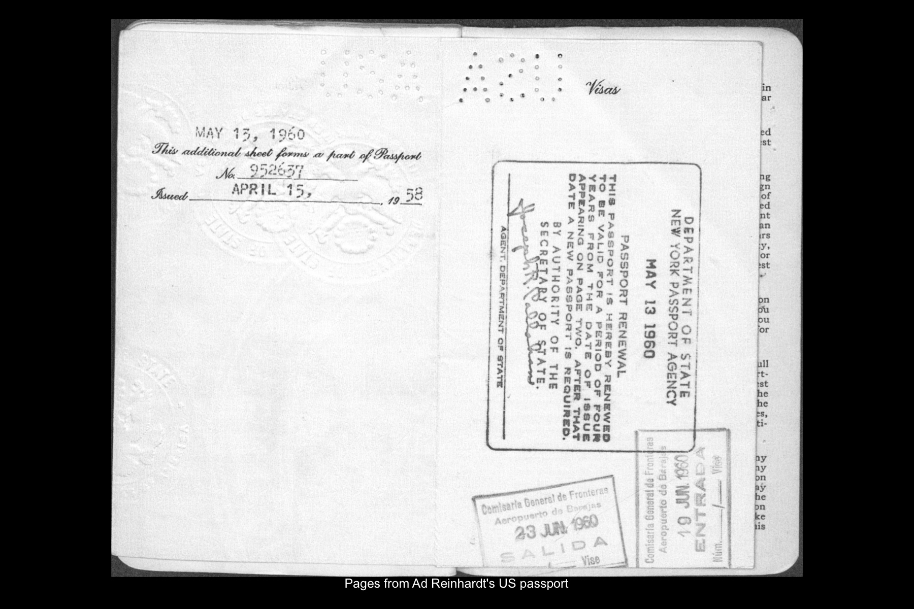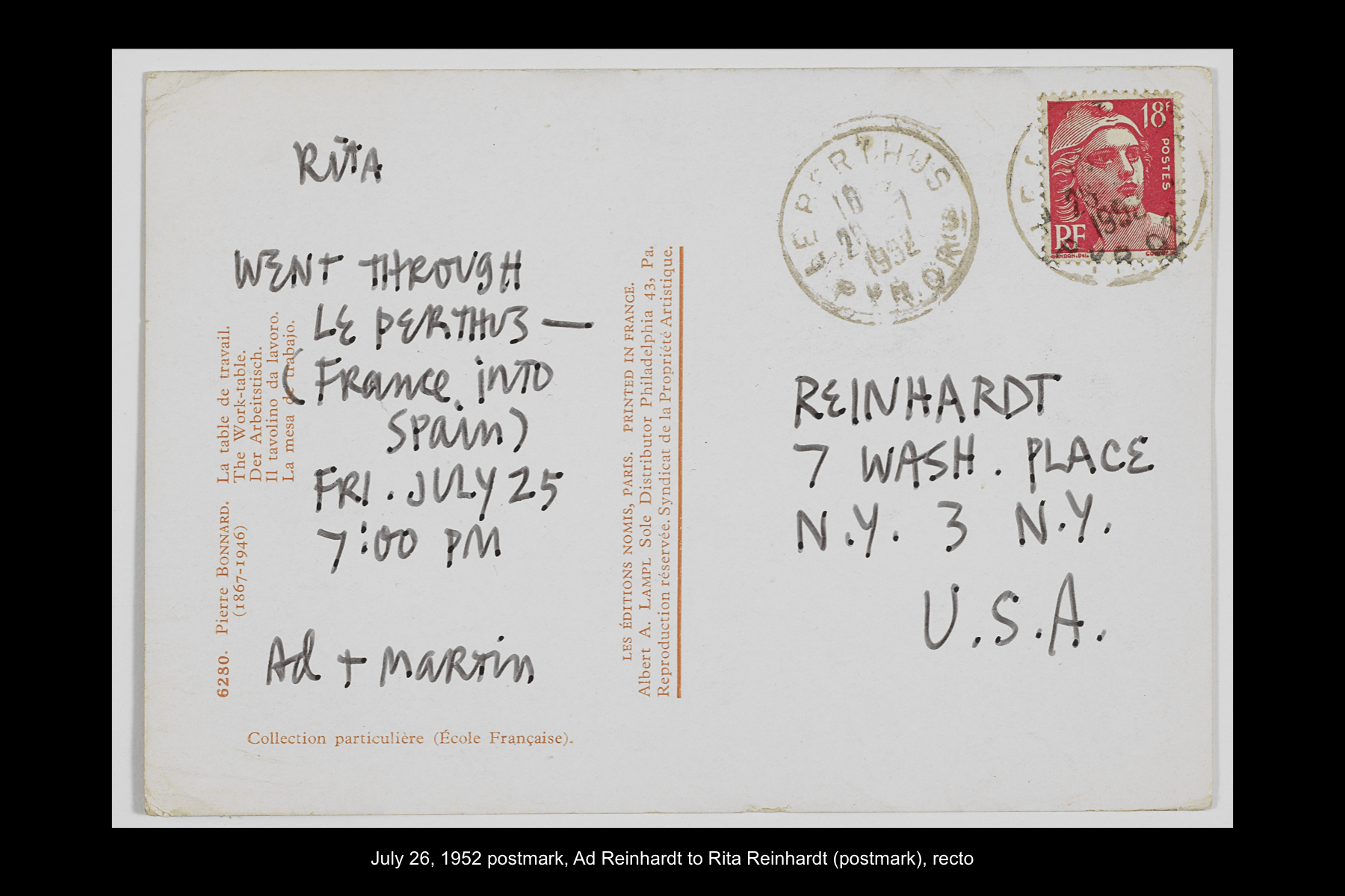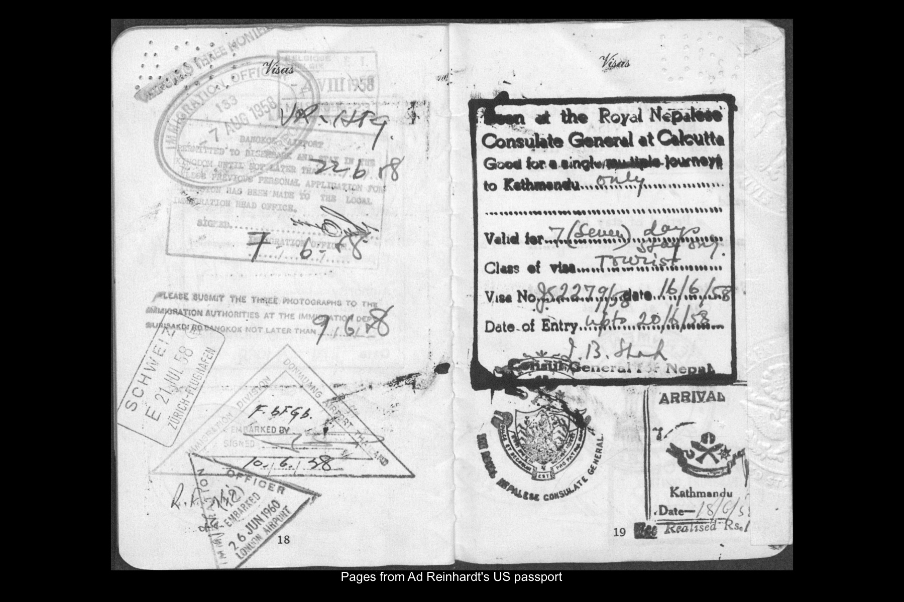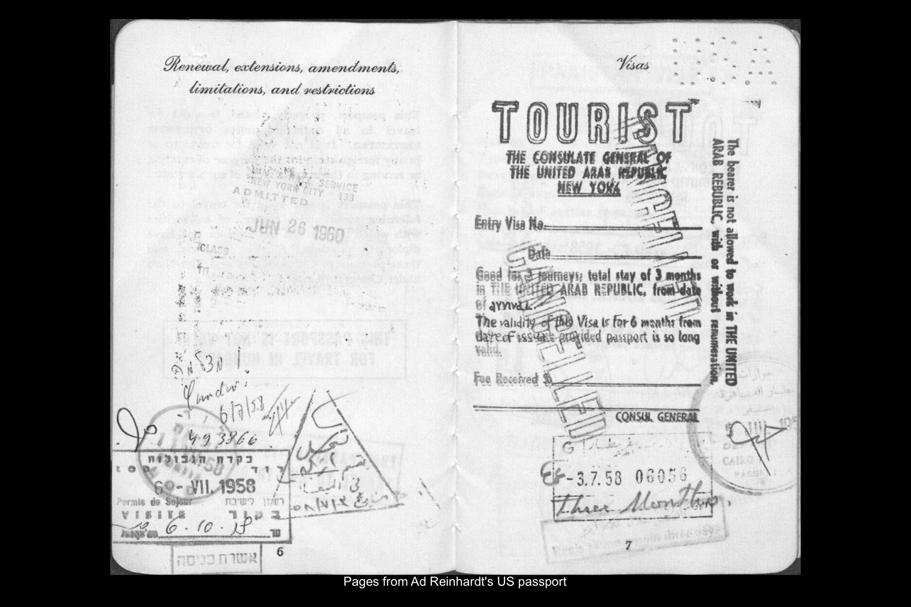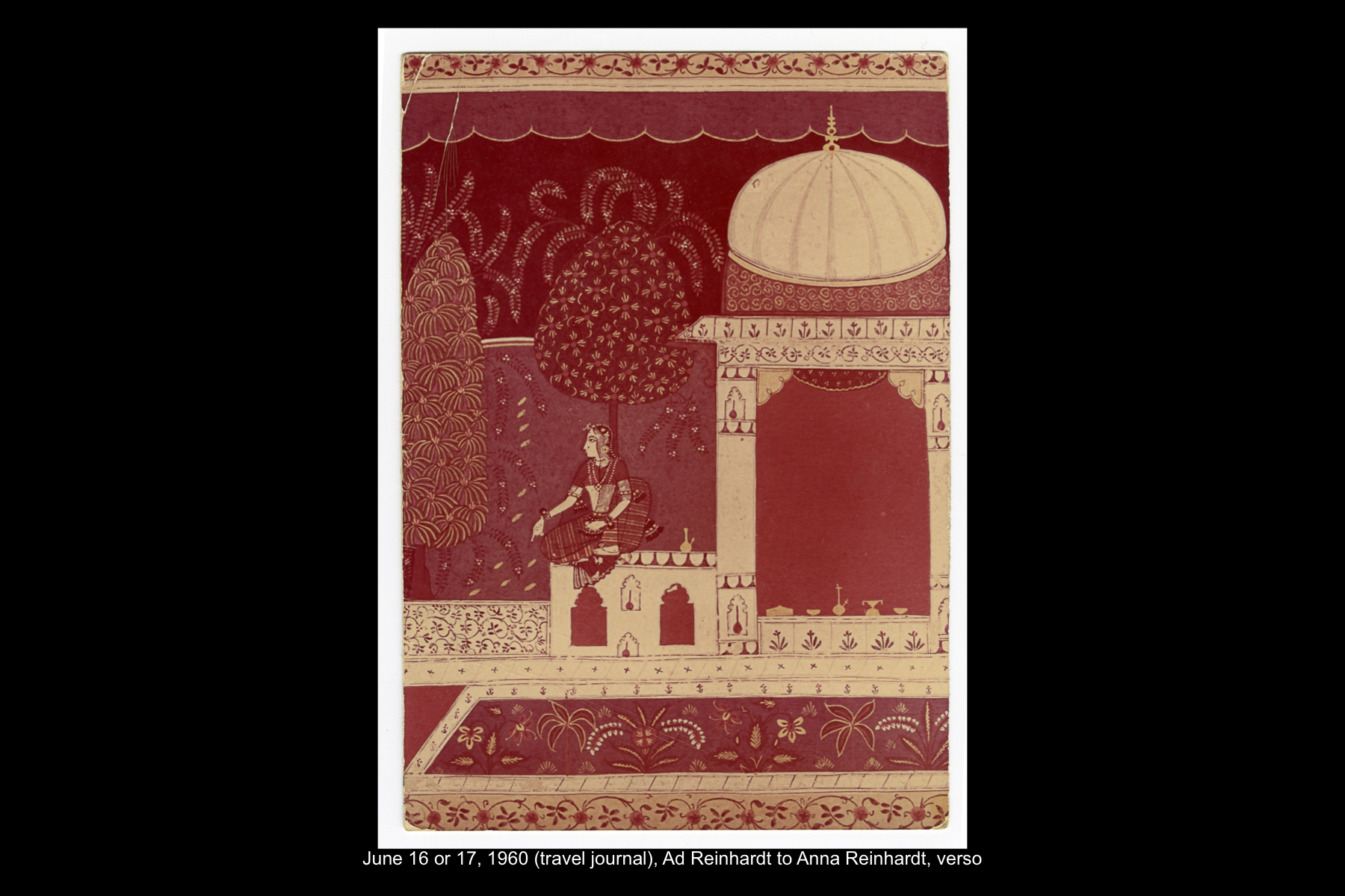 In June 1960 Reinhardt travelled to Paris to install his solo show Mysticisme athée at Galerie Iris Clert. After the opening of his Paris show, he flew to Madrid and visited the Prado museum, followed by a five-day Thomas Cook bus tour of Madrid, Córdoba, Sevilla, and Granada. While Reinhardt did not keep a travel journal for this 3-week trip, correspondence to his wife, Rita, and daughter, Anna, provides many key details. In letters to Rita he indicates that taking the Cook’s tour was the best way to ensure that he would see all that he wanted to see of Moorish Spain. See here for postcards and letters to his wife, Rita, and daughter, Anna from this trip. See here for Reinhardt's passport pages showing stamps from this trip.