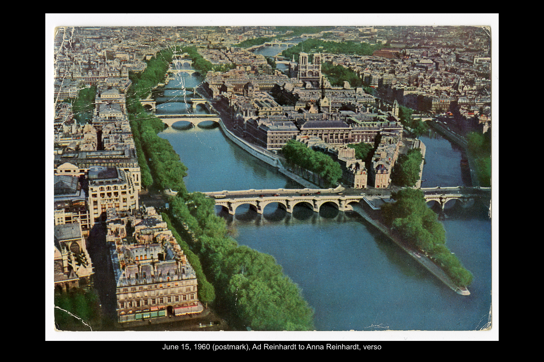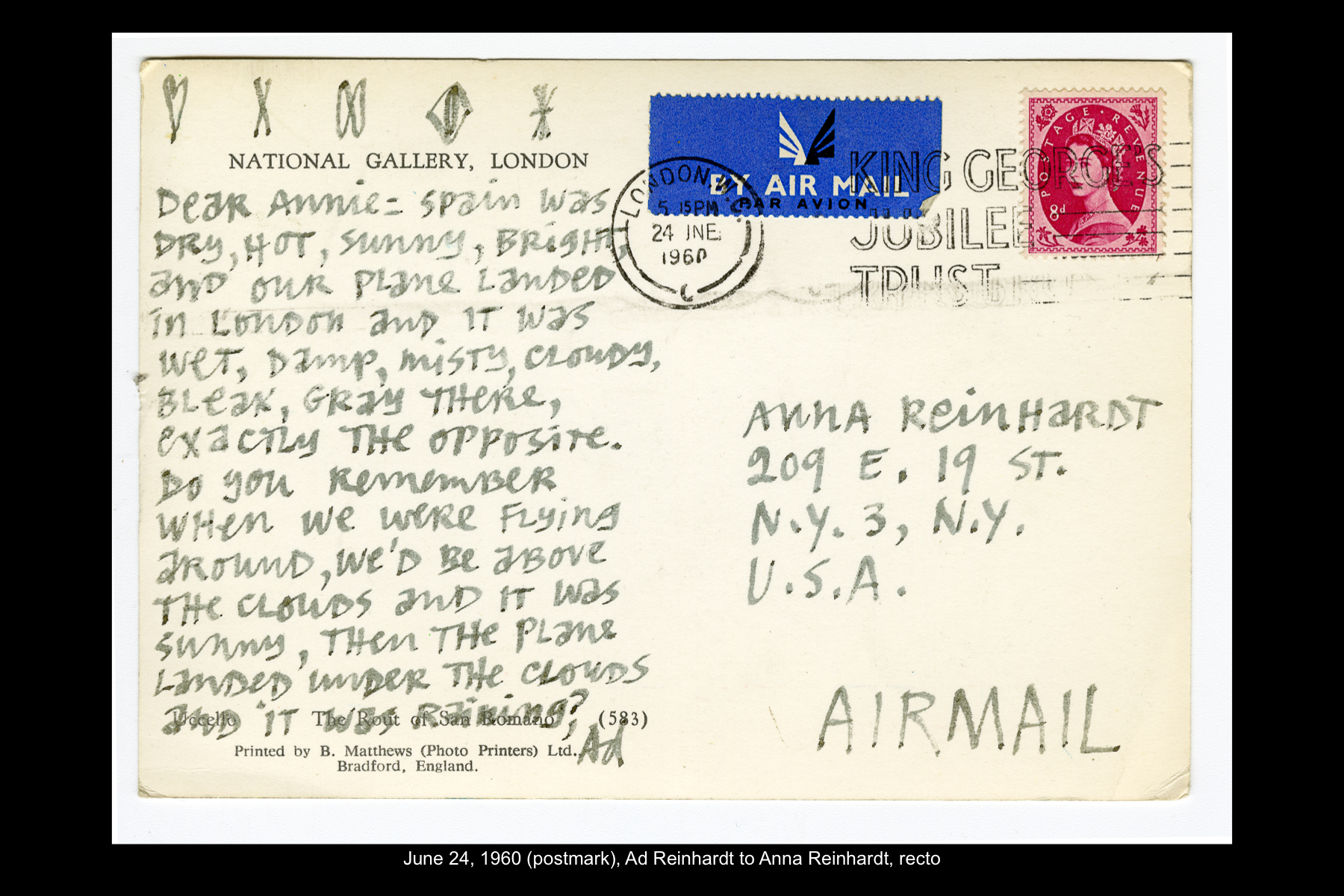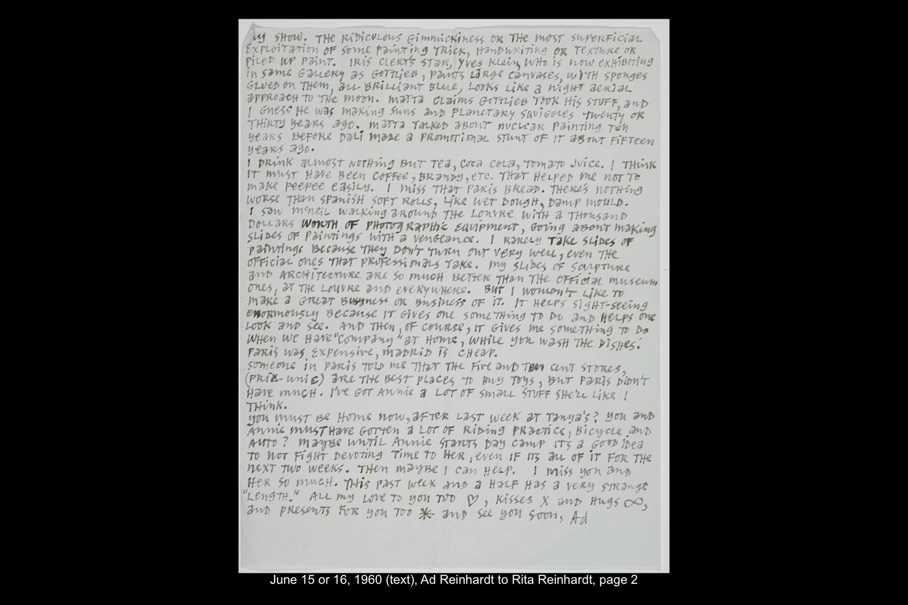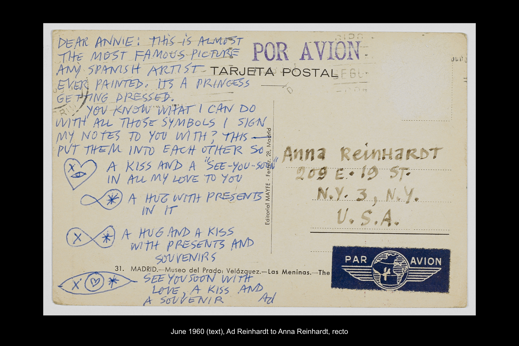 In June 1960 Reinhardt travelled to Paris to install his solo show Mysticisme athée at Galerie Iris Clert. After the opening of his Paris show, he flew to Madrid and visited the Prado museum, followed by a five-day Thomas Cook bus tour of Madrid, Córdoba, Sevilla, and Granada. While Reinhardt did not keep a travel journal for this 3-week trip, correspondence to his wife, Rita, and daughter, Anna, provides many key details. In letters to Rita he indicates that taking the Cook’s tour was the best way to ensure that he would see all that he wanted to see of Moorish Spain. See here for postcards and letters to his wife, Rita, and daughter, Anna from this trip. See here for Reinhardt's passport pages showing stamps from this trip.