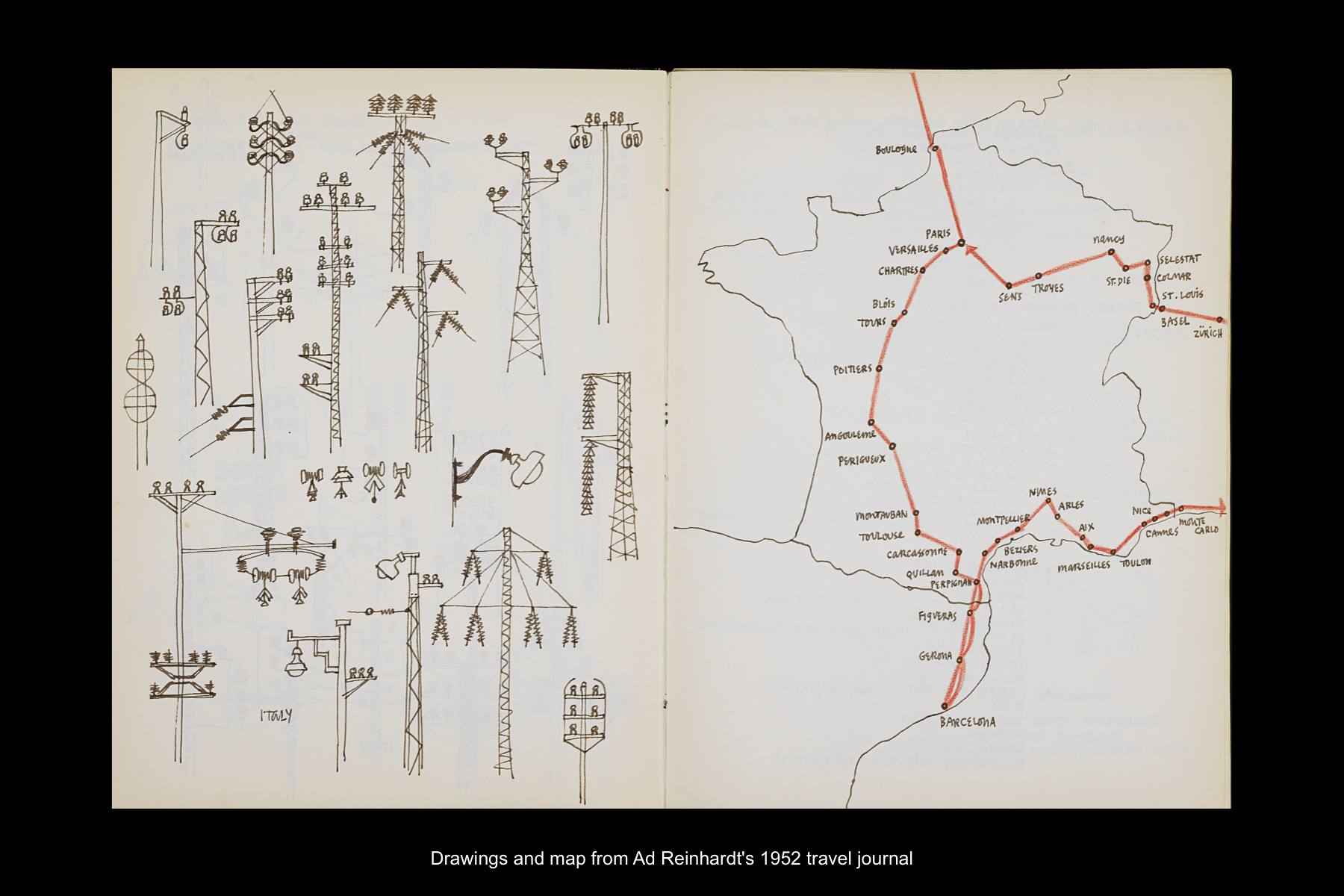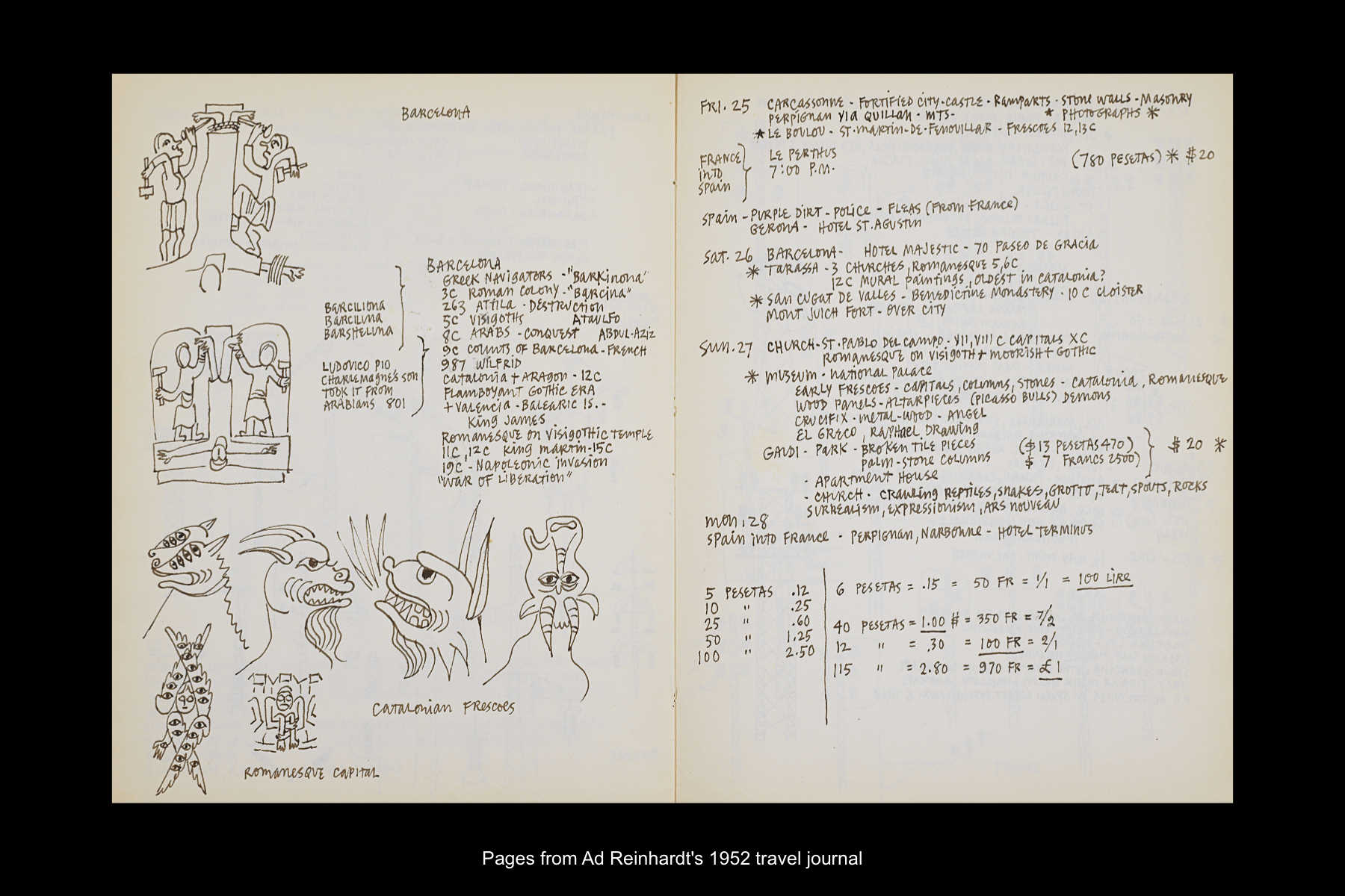 Reinhardt’s first visit to Spain took place in July 1952, when he stopped in Girona and Barcelona during an extensive, two-month trip to Europe. While his time in Spain was short on this trip, just two full days, Reinhardt visited many sites in and around Barcelona, including churches in Tarassa, the Monastery of San Cugat de Vallès, The Church of San Pablo de Campo, The National Palace Museum, and examples of Gaudí’s architecture. Reinhardt’s 1952 travel journal provides a daily account of this trip. See here for the page detailing his journey from the southwest of France into northeastern Spain on July 25, 1952; the places he visited on July 26–27; and his departure from Spain on July 28. See here for Reinhardt’s hand-drawn map from his travel journal of his itinerary in France and Spain. See here for postcards to his wife, Rita from this trip.