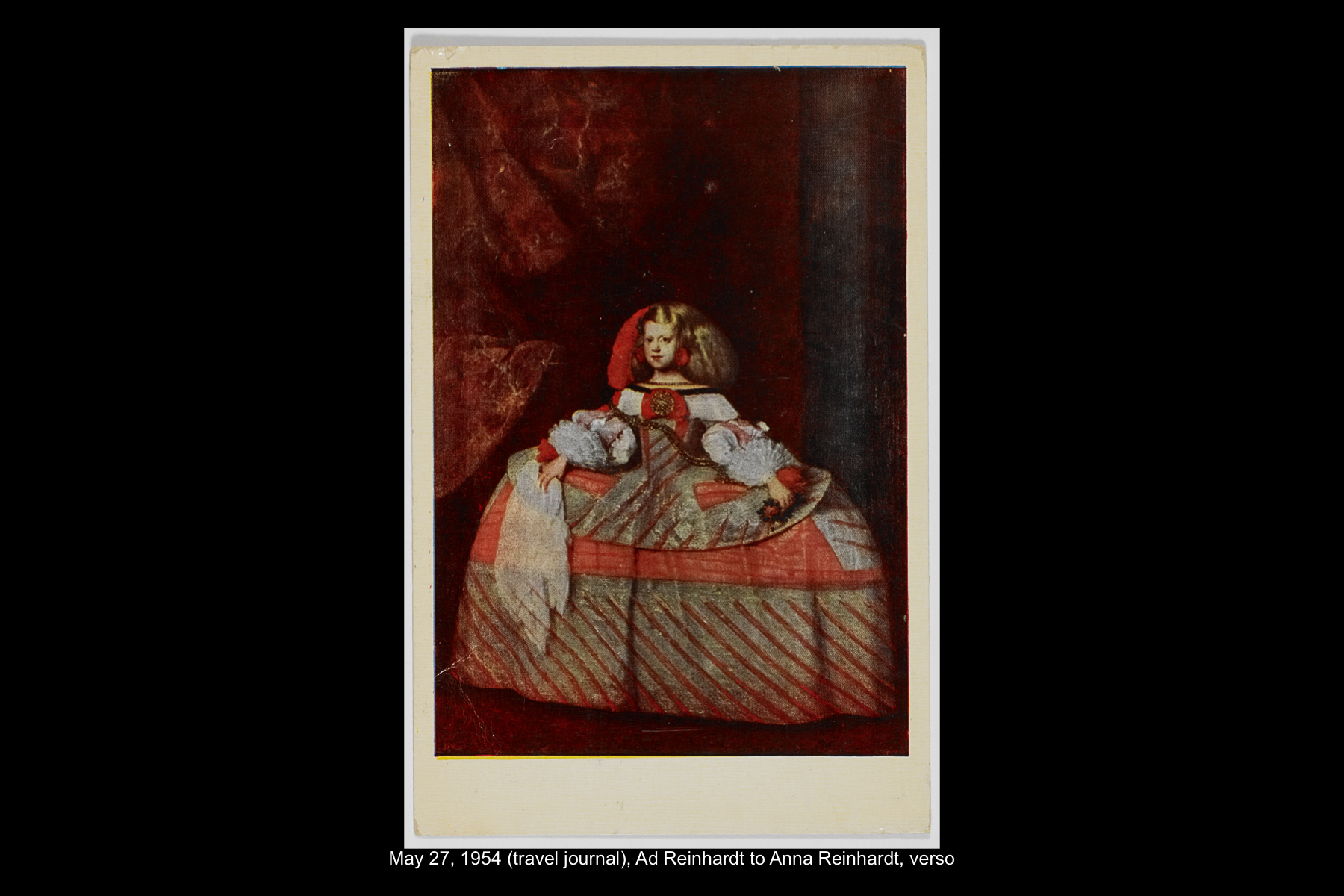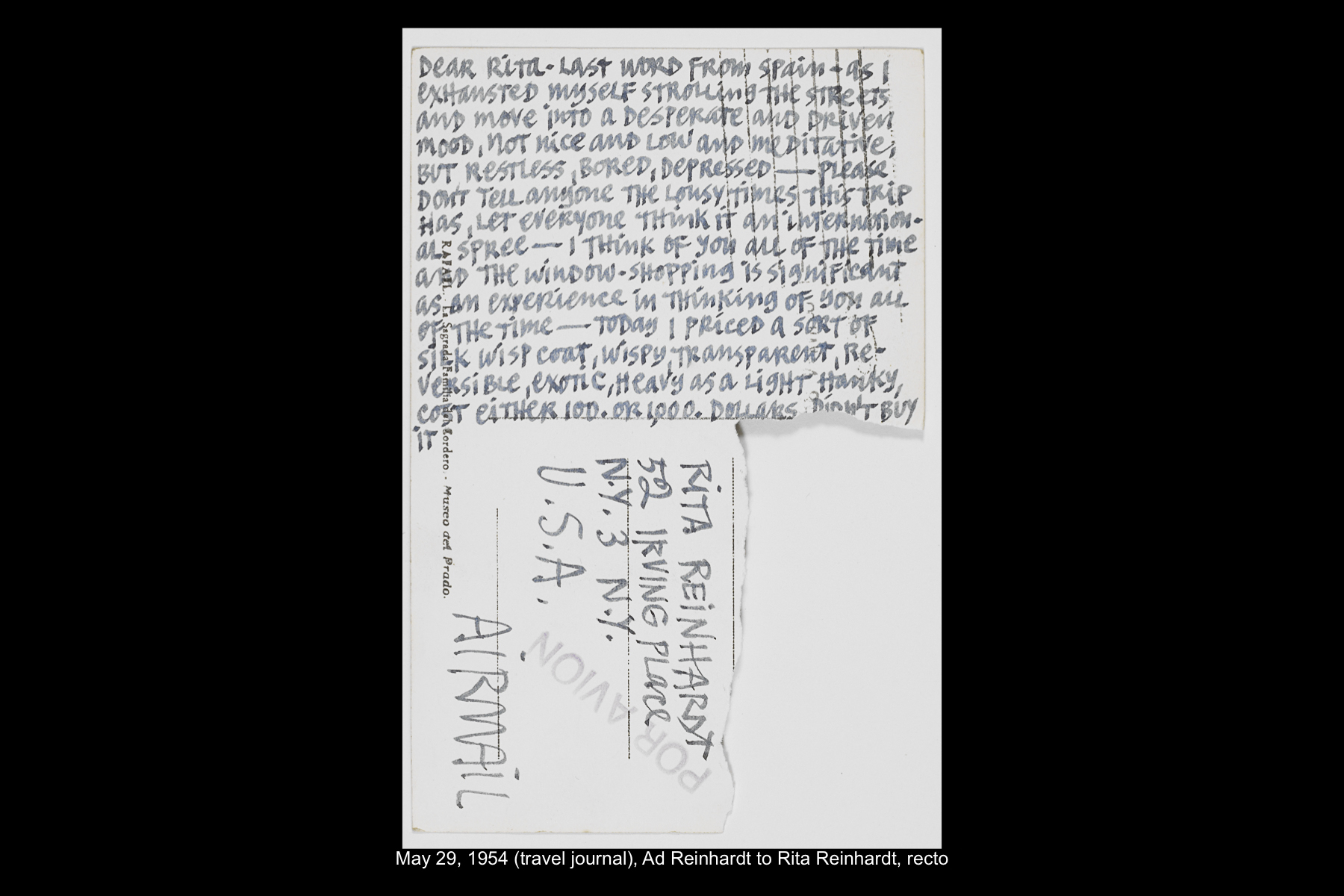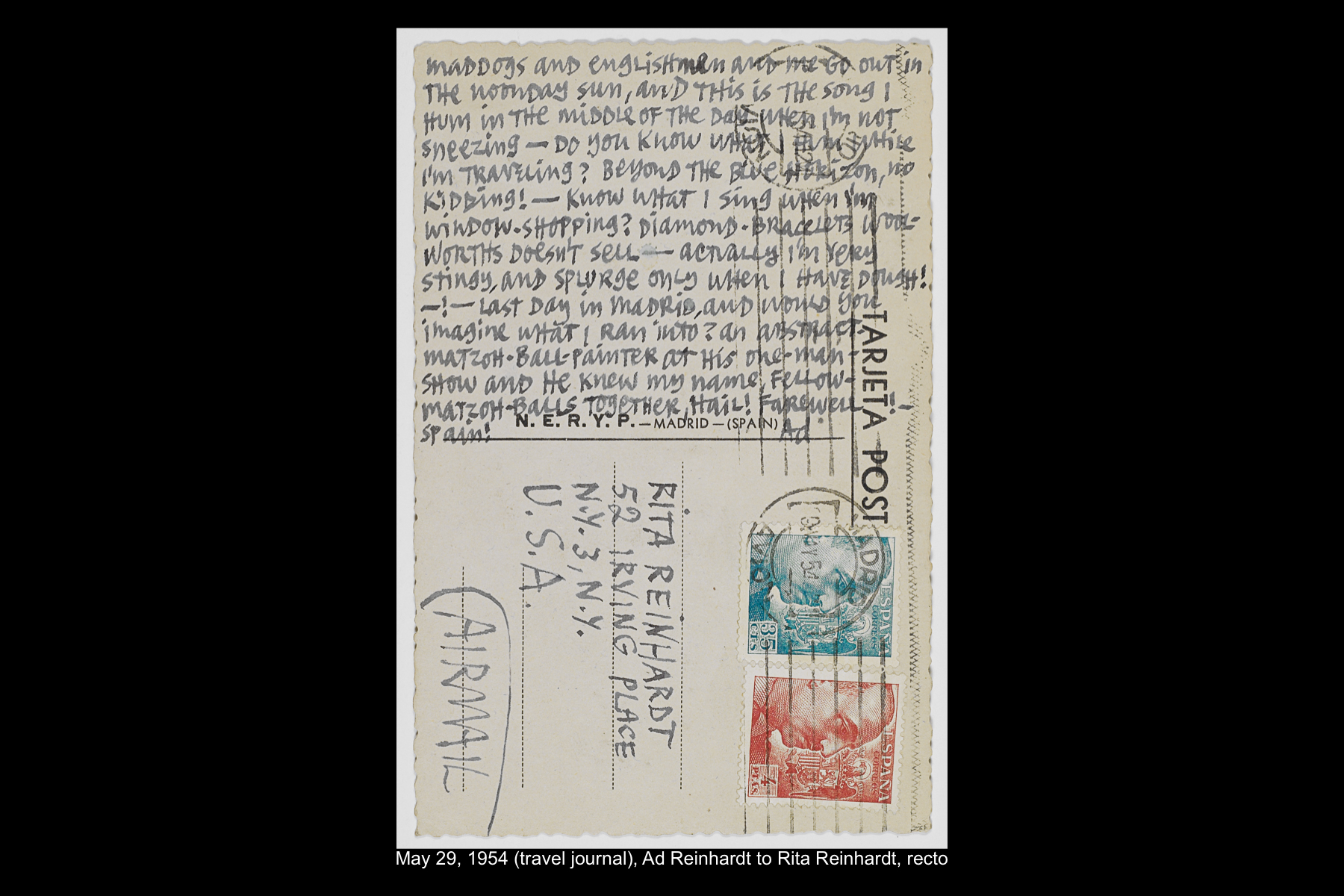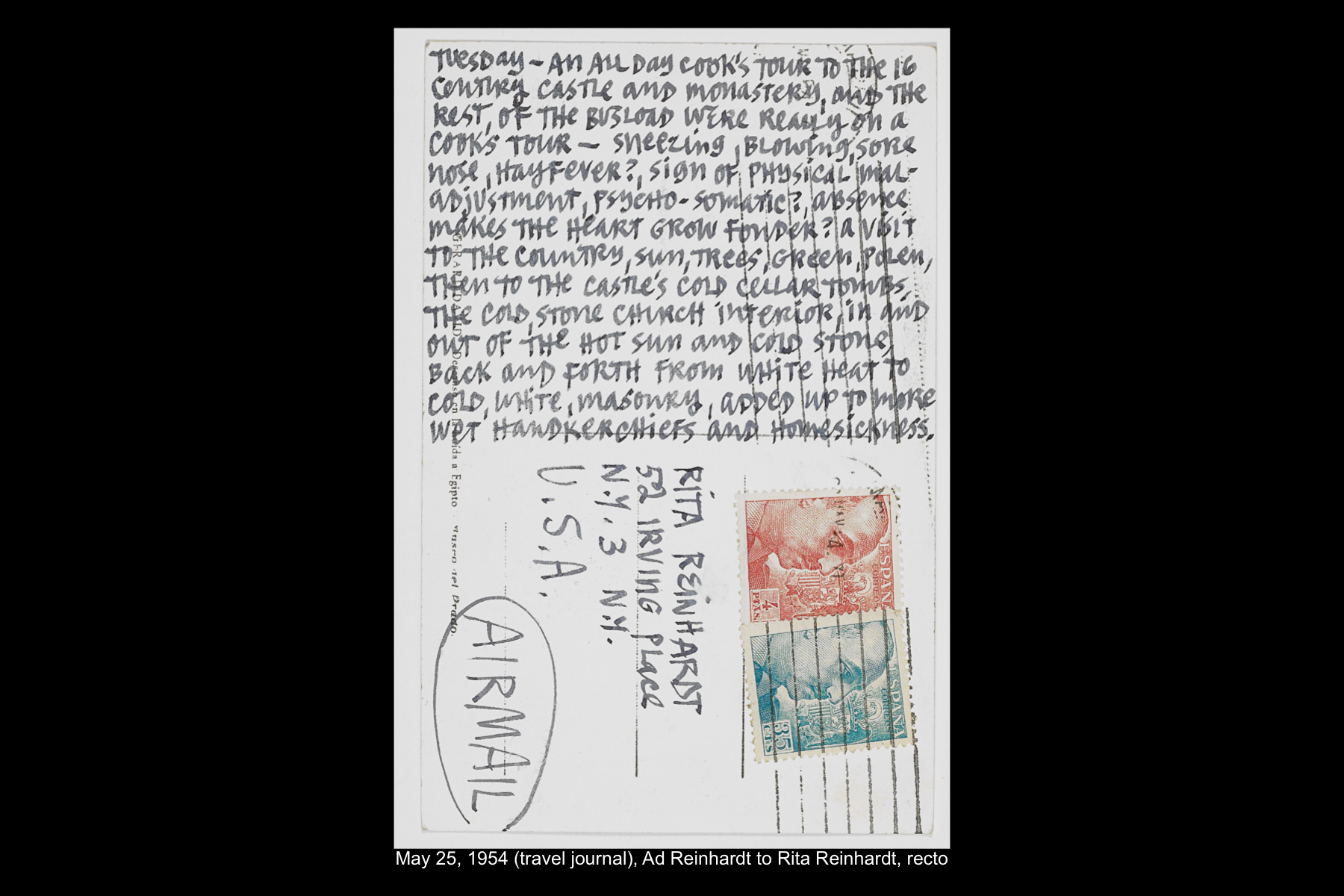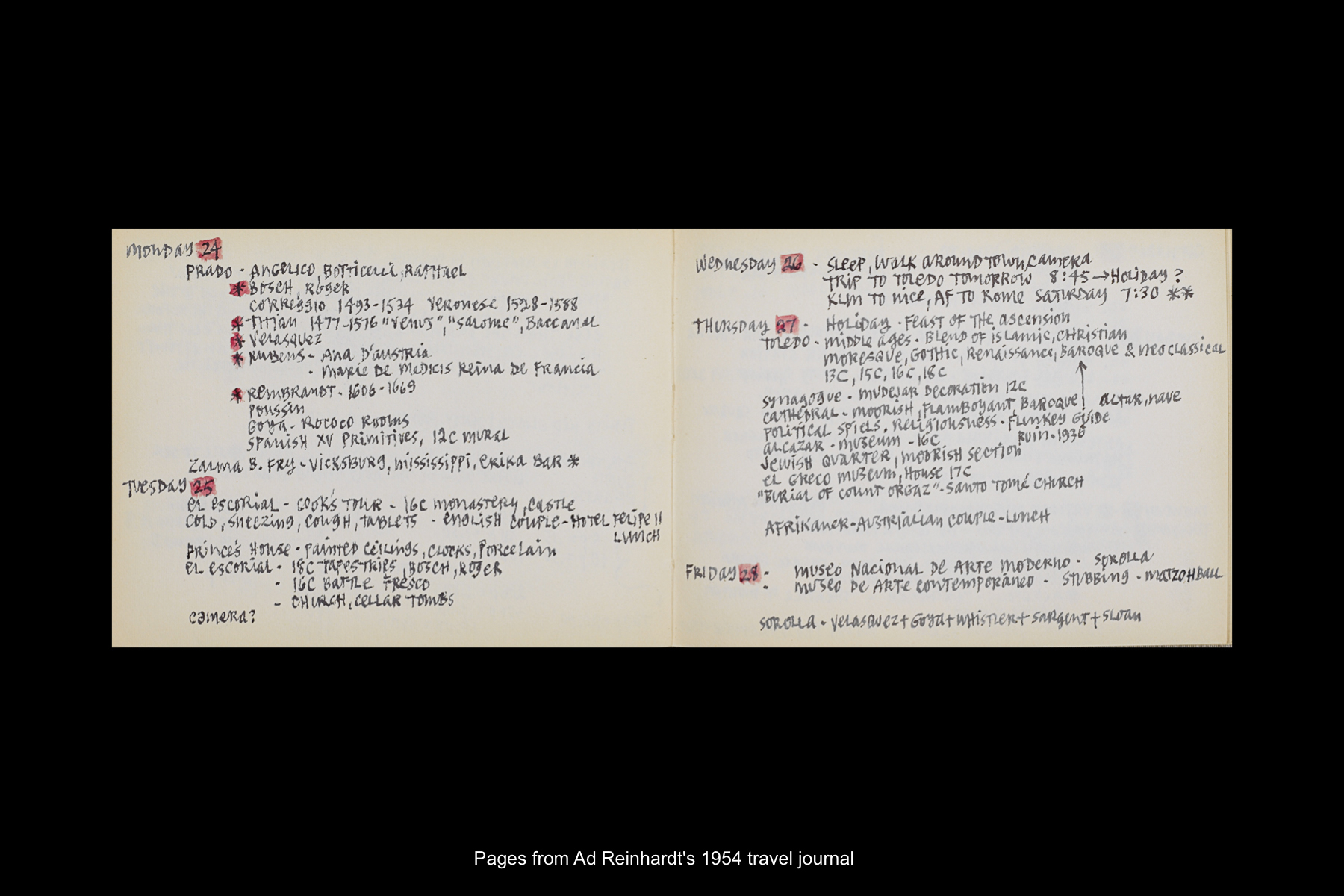 In May 1954, while on sabbatical from Brooklyn College, Reinhardt embarked on a five-week trip to Europe and Greece. Staying in Madrid for six full days, Reinhardt had time to visit the Prado Museum twice, as well as the Museo Nacional de Arte Moderno and the Museo de Arte Contemporáneo. He also took an all-day Thomas Cook tour of El Escorial, and a day trip to Toledo. See here for Reinhardt’s travel journal pages for his May 22–29, 1954 stay in Northern Spain. See here for postcards and letters to his wife, Rita, and young daughter, Anna from this trip.