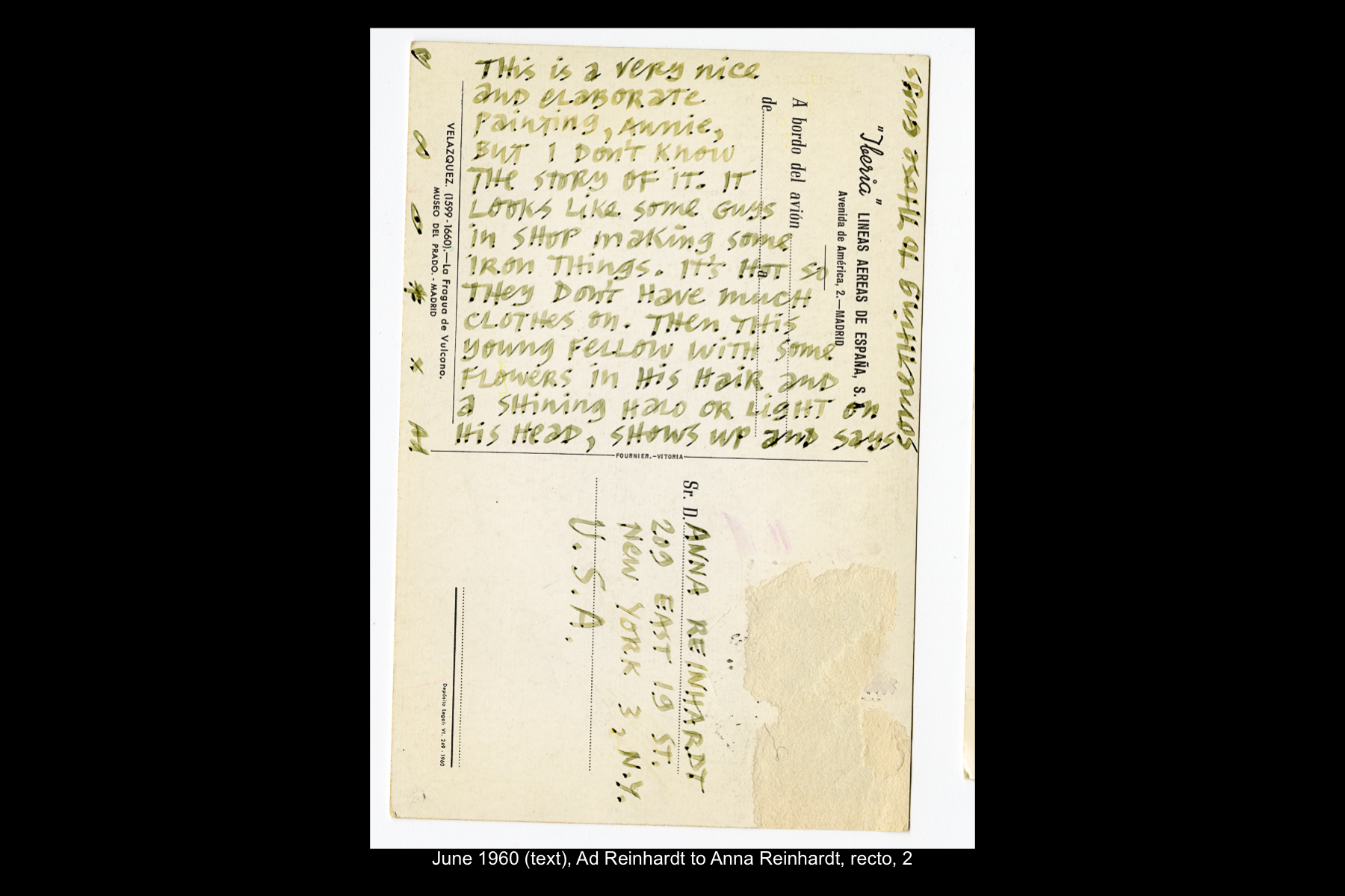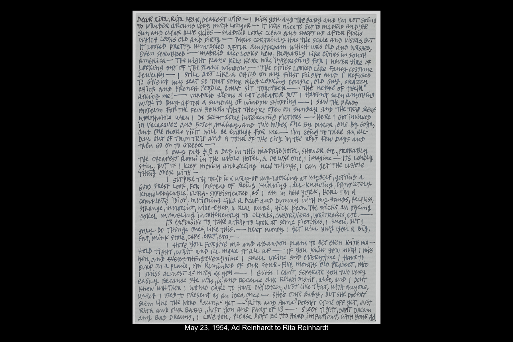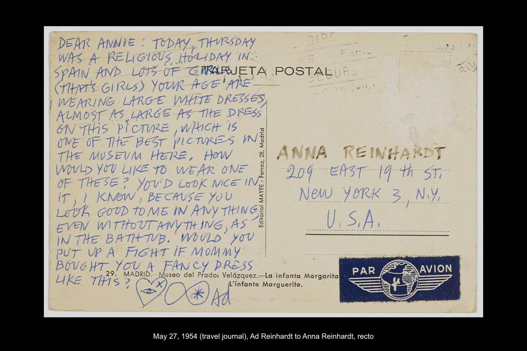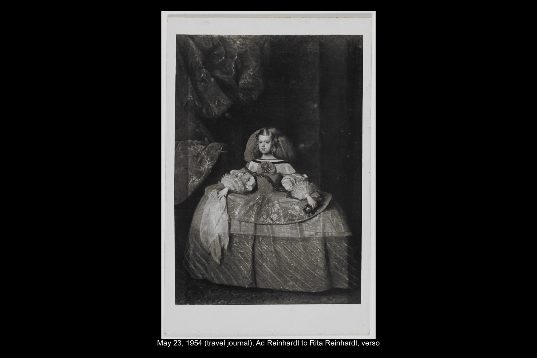 In May 1954, while on sabbatical from Brooklyn College, Reinhardt embarked on a five-week trip to Europe and Greece. Staying in Madrid for six full days, Reinhardt had time to visit the Prado Museum twice, as well as the Museo Nacional de Arte Moderno and the Museo de Arte Contemporáneo. He also took an all-day Thomas Cook tour of El Escorial, and a day trip to Toledo. See here for Reinhardt’s travel journal pages for his May 22–29, 1954 stay in Northern Spain. See here for postcards and letters to his wife, Rita, and young daughter, Anna from this trip.