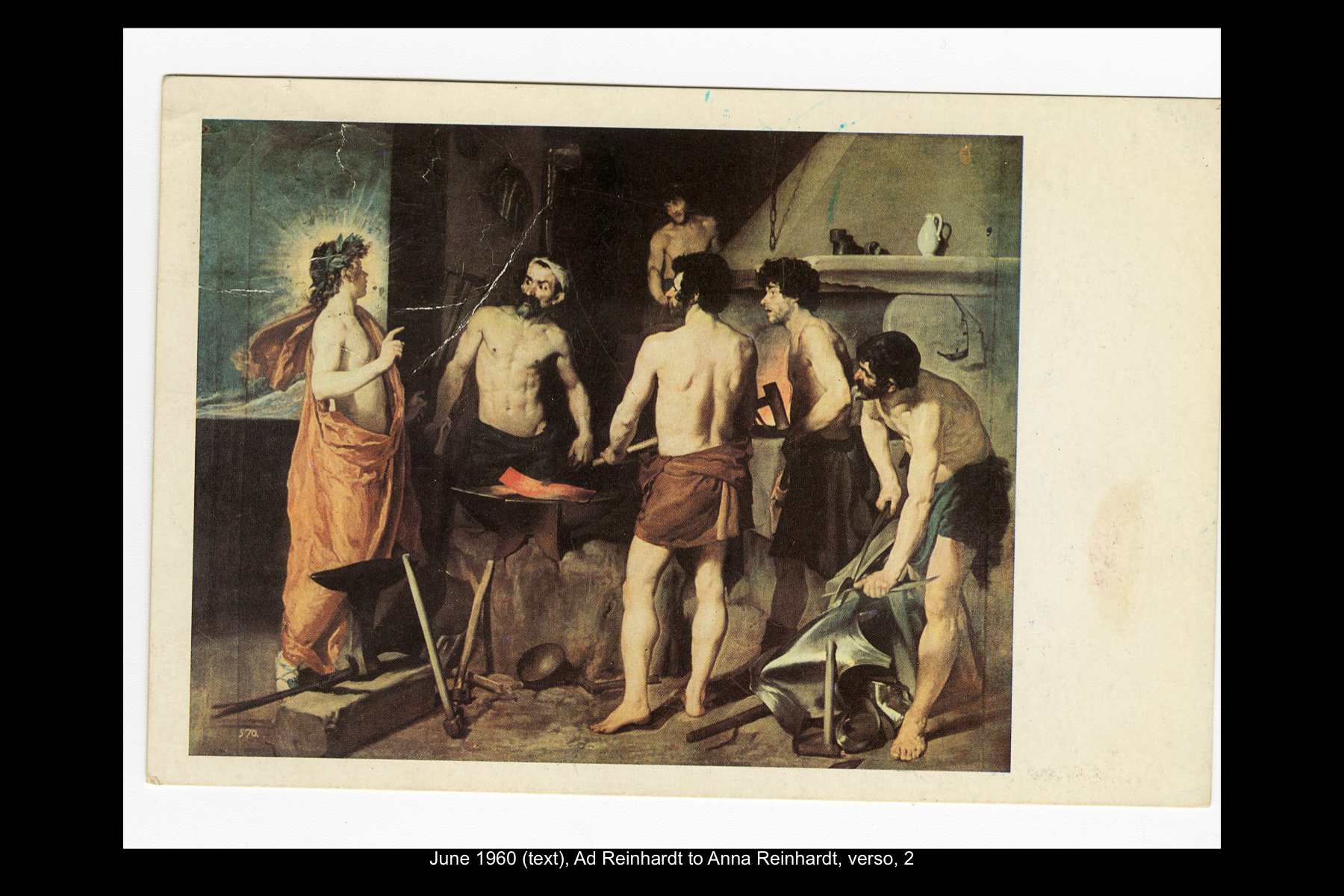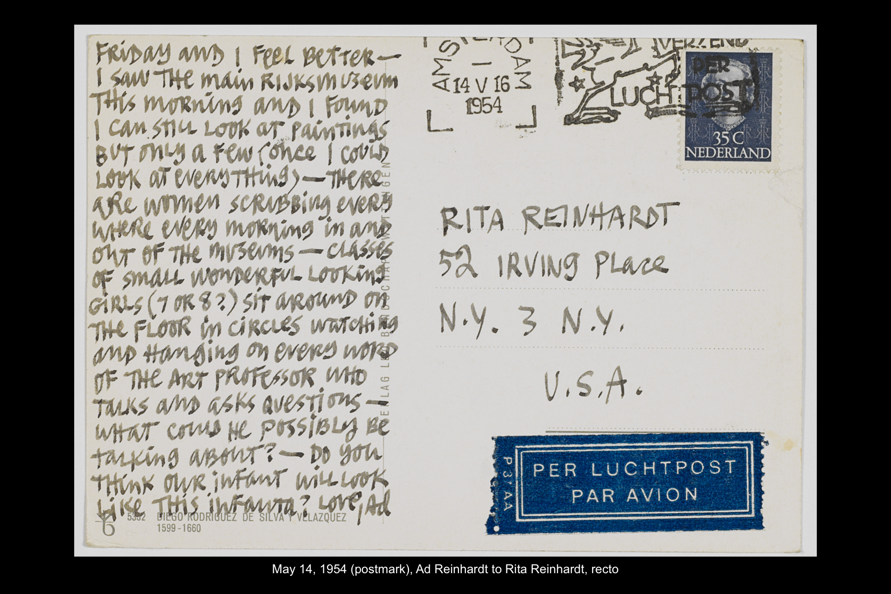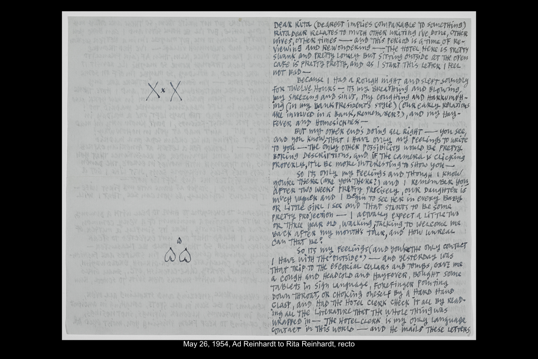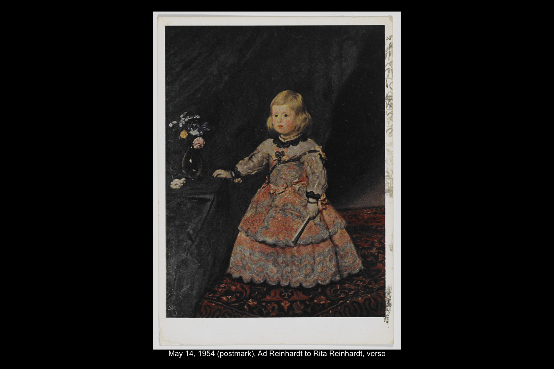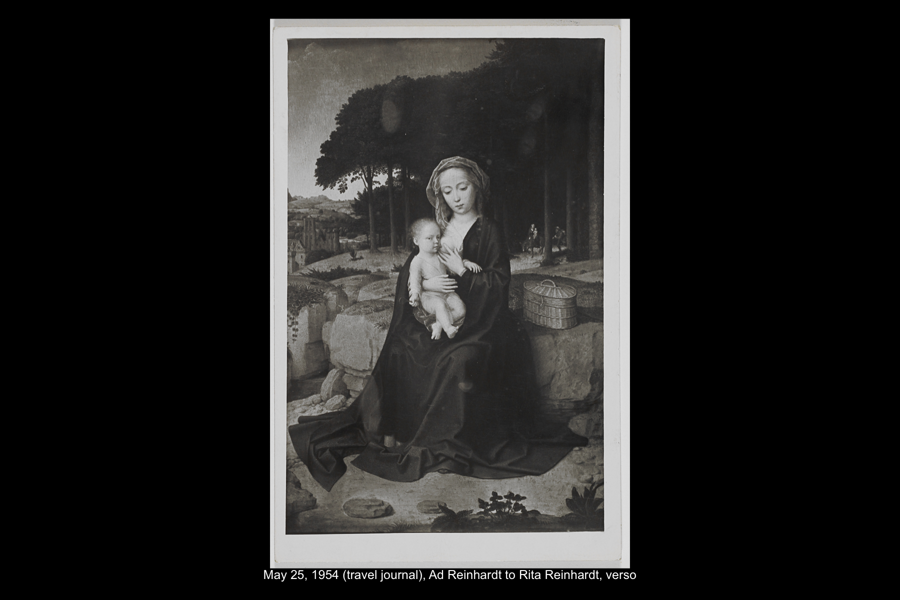 In May 1954, while on sabbatical from Brooklyn College, Reinhardt embarked on a five-week trip to Europe and Greece. Staying in Madrid for six full days, Reinhardt had time to visit the Prado Museum twice, as well as the Museo Nacional de Arte Moderno and the Museo de Arte Contemporáneo. He also took an all-day Thomas Cook tour of El Escorial, and a day trip to Toledo. See here for Reinhardt’s travel journal pages for his May 22–29, 1954 stay in Northern Spain. See here for postcards and letters to his wife, Rita, and young daughter, Anna from this trip.