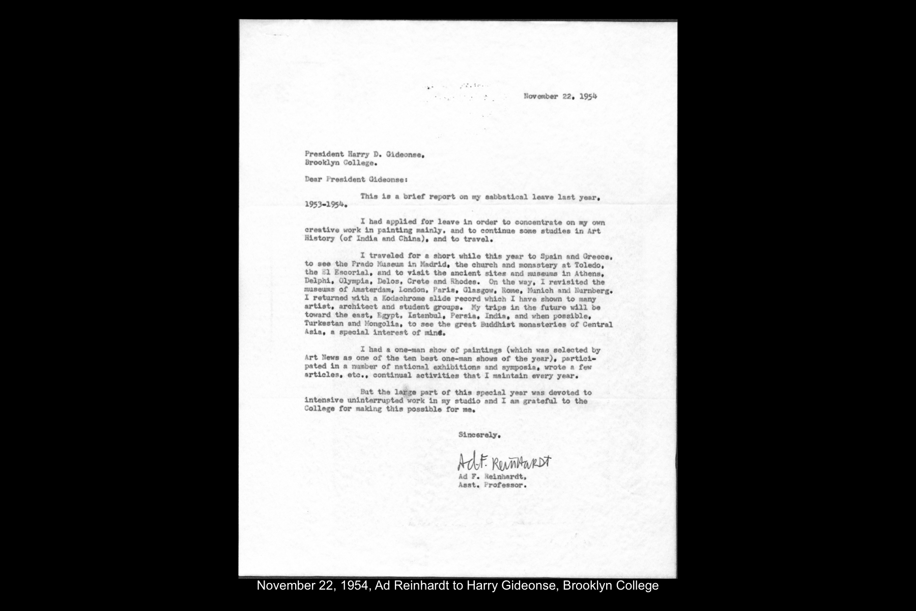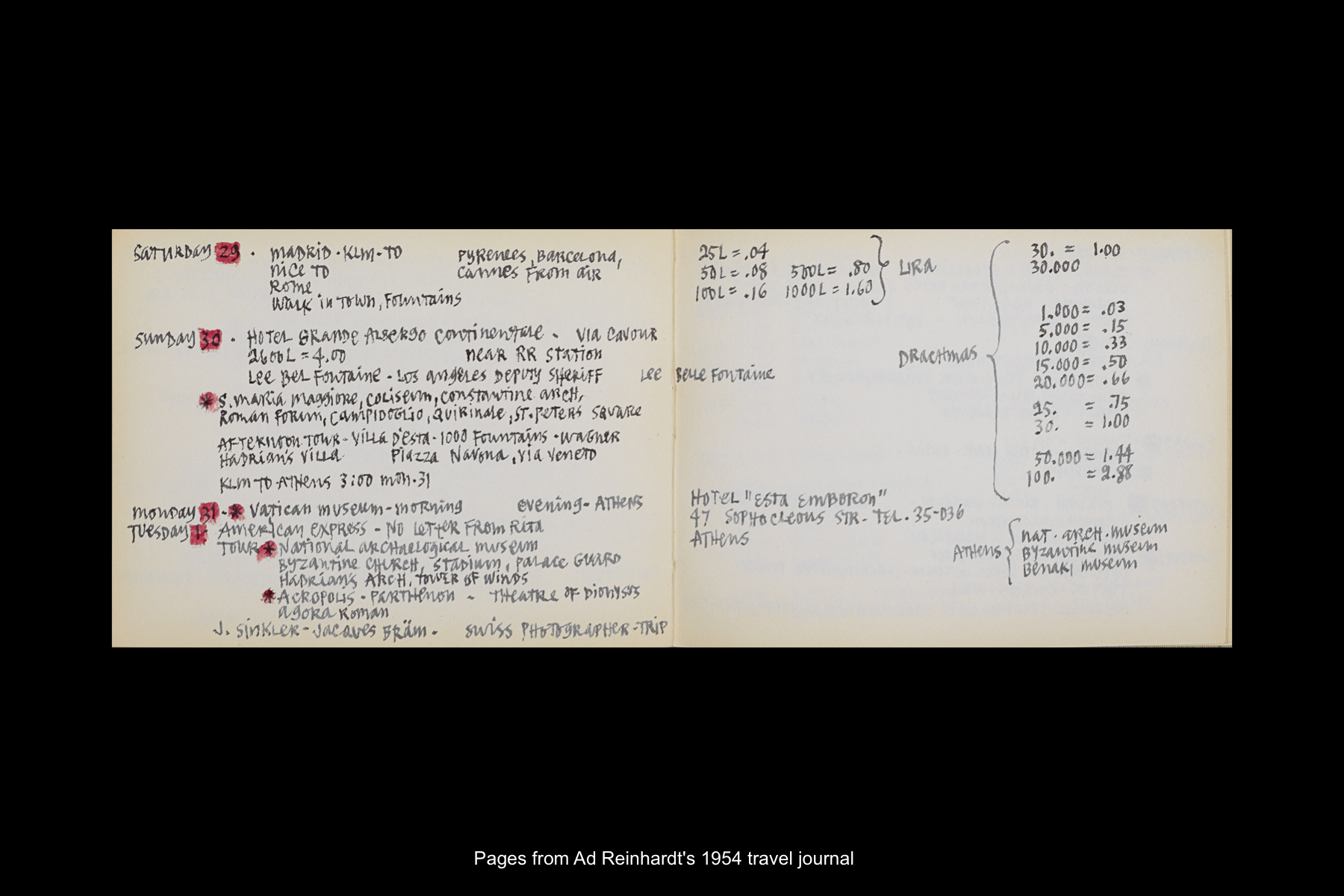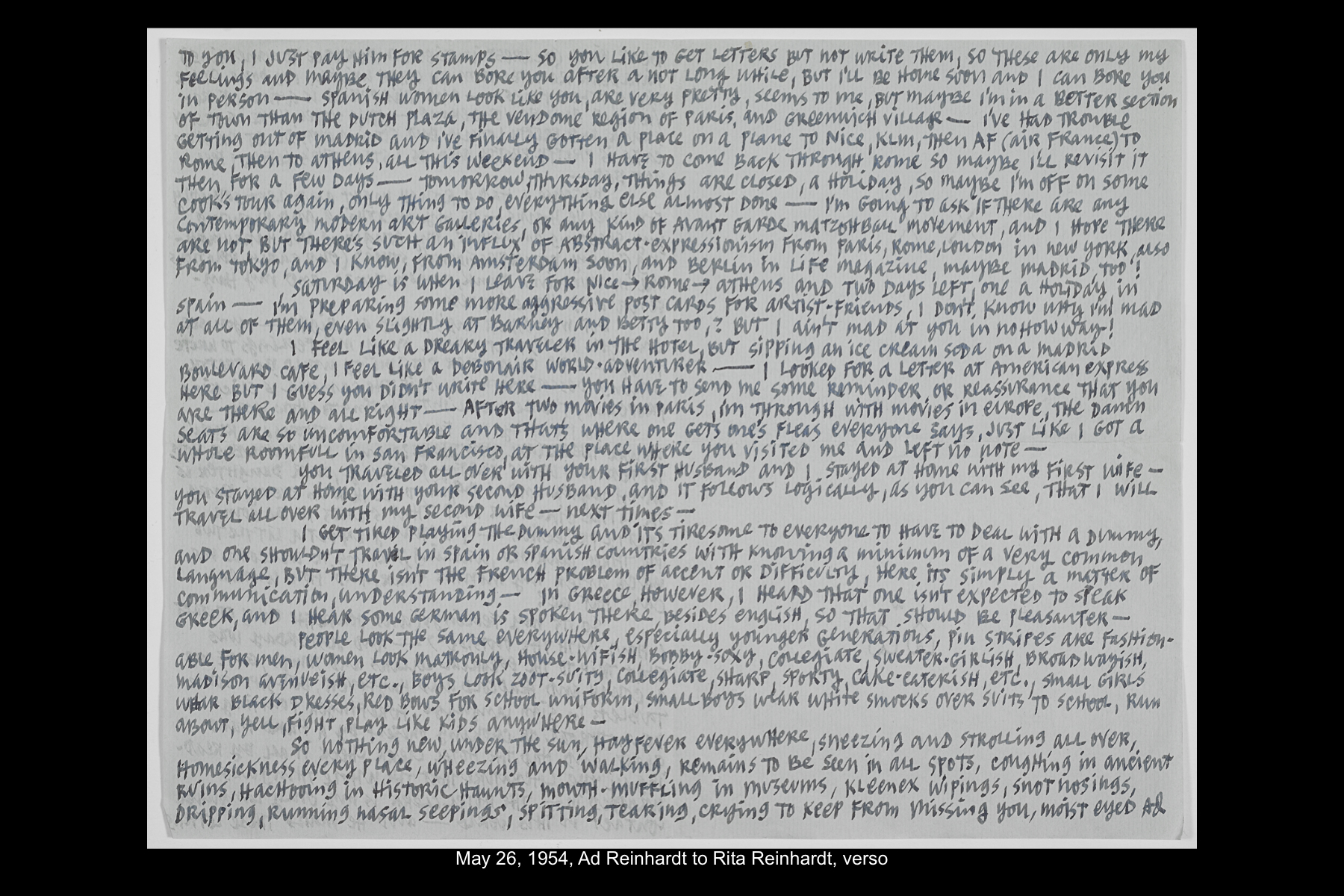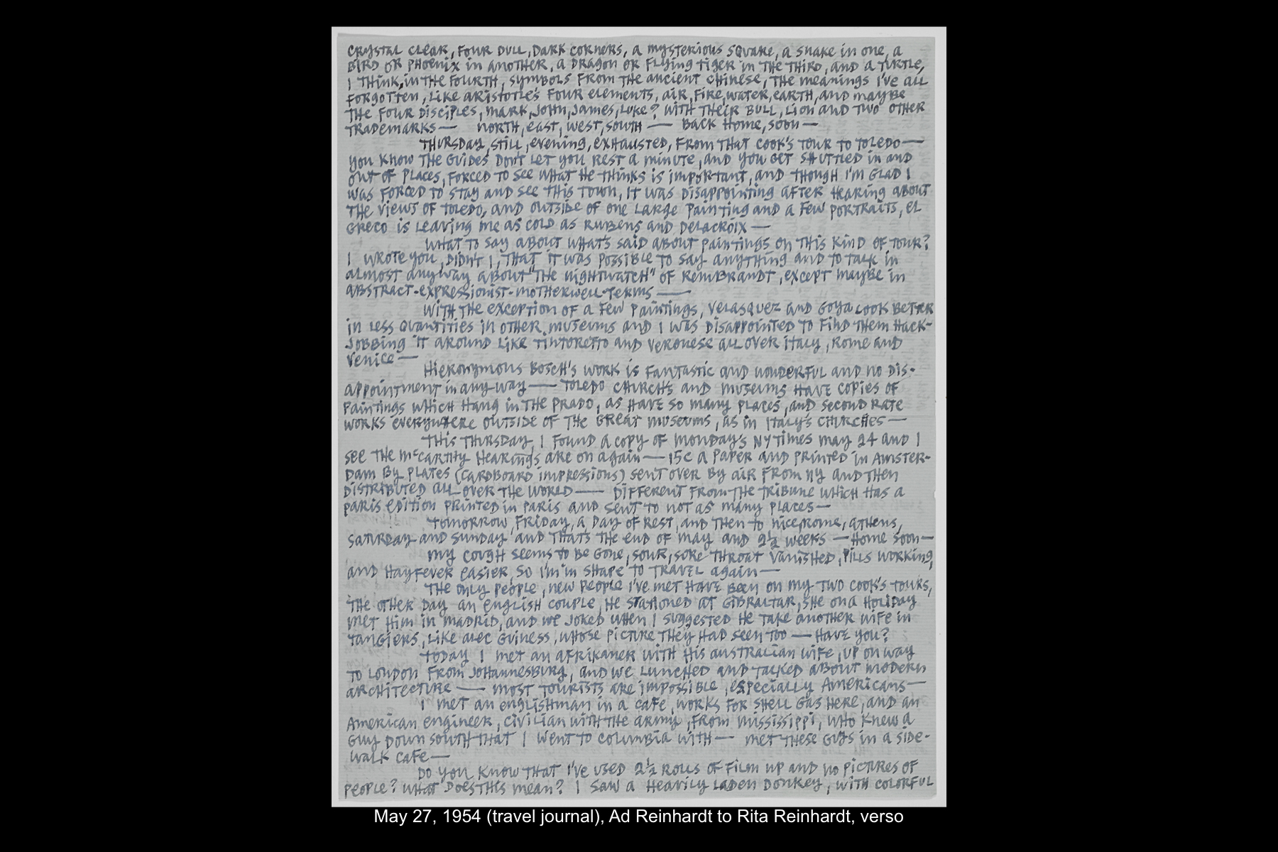 Ad Reinhardt was an avid world traveler and visited Spain four times in his lifetime. These visits to Spain took place during Reinhardt’s extensive trips abroad in 1952, 1954, 1960, and 1967. For Reinhardt, travel was an opportunity to enrich his knowledge as both an artist and a professor of art and art history, through the experience of seeing the great works of art history, visiting cultural landmarks, museums, and galleries, and taking photographs for his slide collection. The time Reinhardt spent in Spain, as in other destinations he visited, was precious. As documented in his correspondence and travel journals, Reinhardt made every effort to see what he wanted to see; as a result, the experience of travel could be at once stimulating and revelatory, melancholy and exhausting.