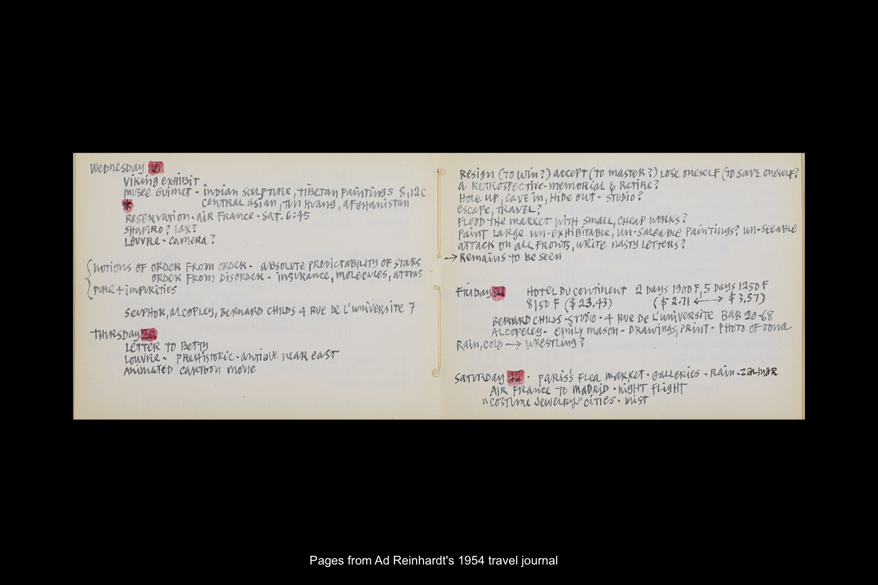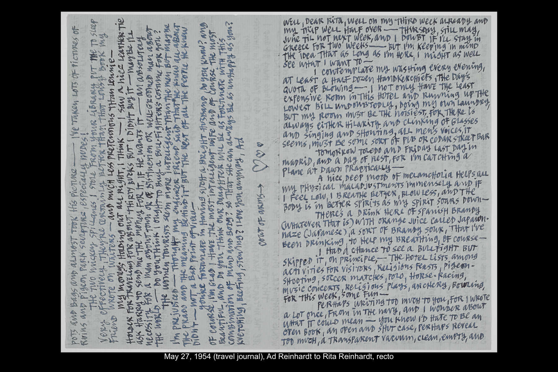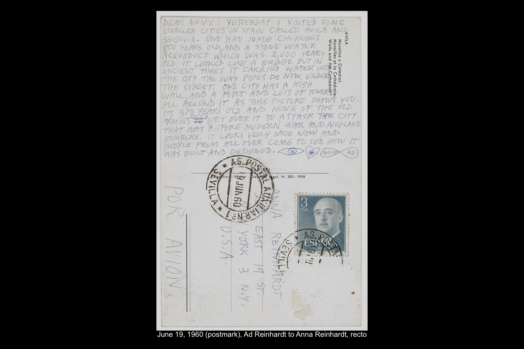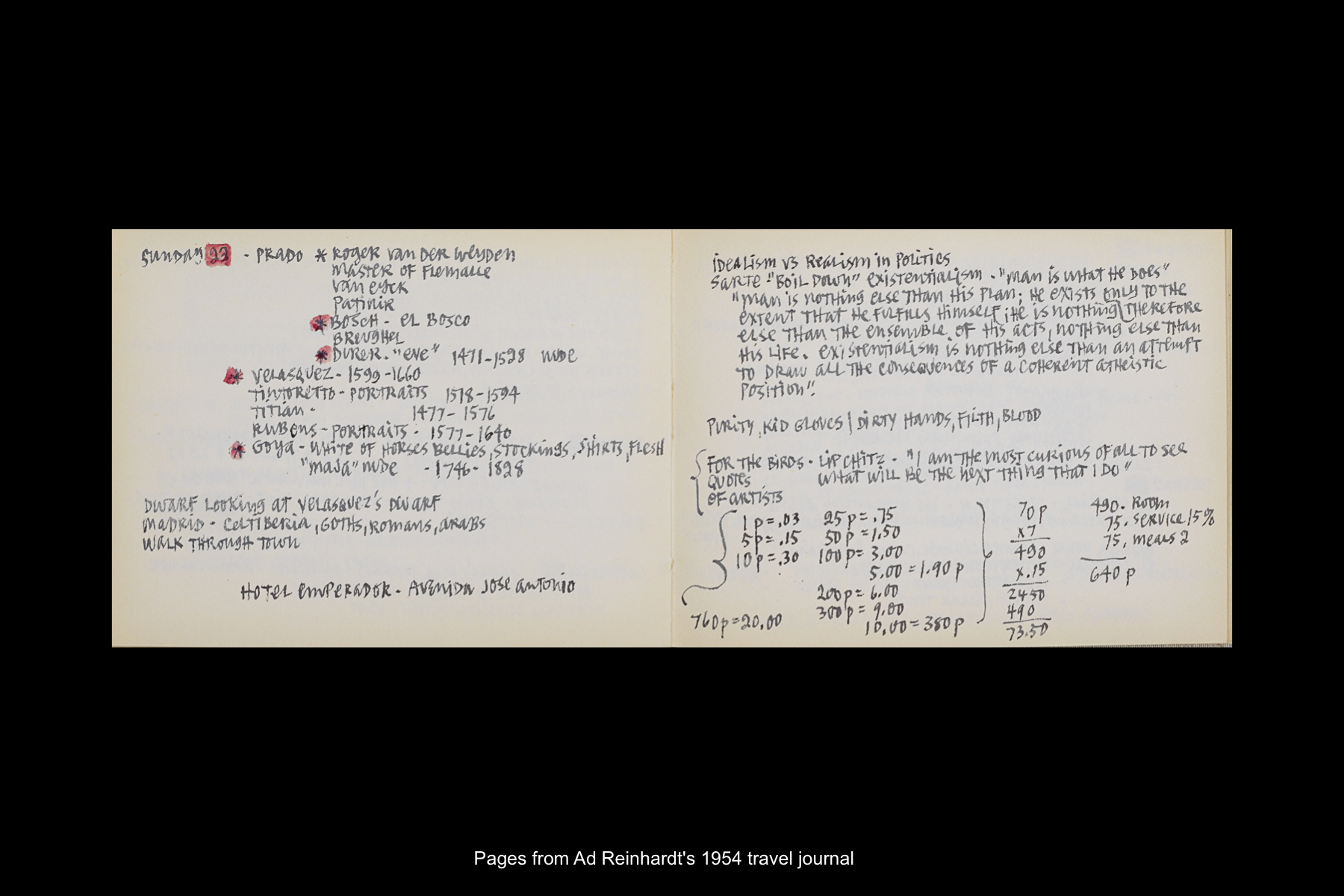 Among the archival holdings of the Ad Reinhardt Foundation are an extensive collection of Reinhardt's letters and postcards to his family and his original travel journals, which provide valuable insight into what Reinhardt saw, experienced, and observed when visiting a particular place. Digitized archival materials related to his travels to Spain can be viewed below.